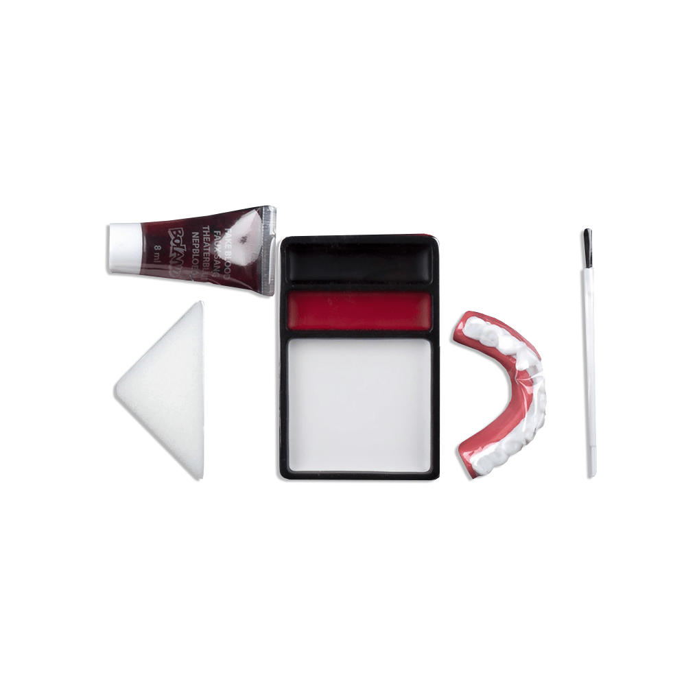 Zawartość produktu: Wampirze kły, tubka sztucznej krwi, tłuszcz do makijażu, gąbka, aplikator