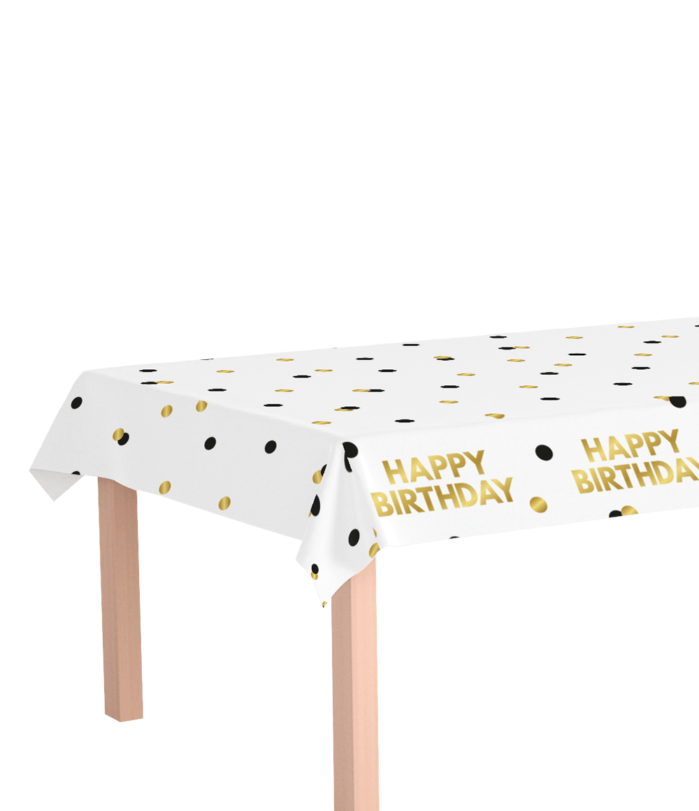 Odświętnie przystroisz stół? W takim razie użyj Celebration! Obrus na stół - Wszystkiego najlepszego! Ten uroczy obrus ma kolory biały, złoty i czarny. Ten obrus o wymiarach 137 x 274 cm pasuje do każdego standardowego stołu.