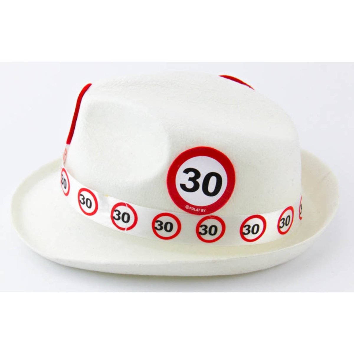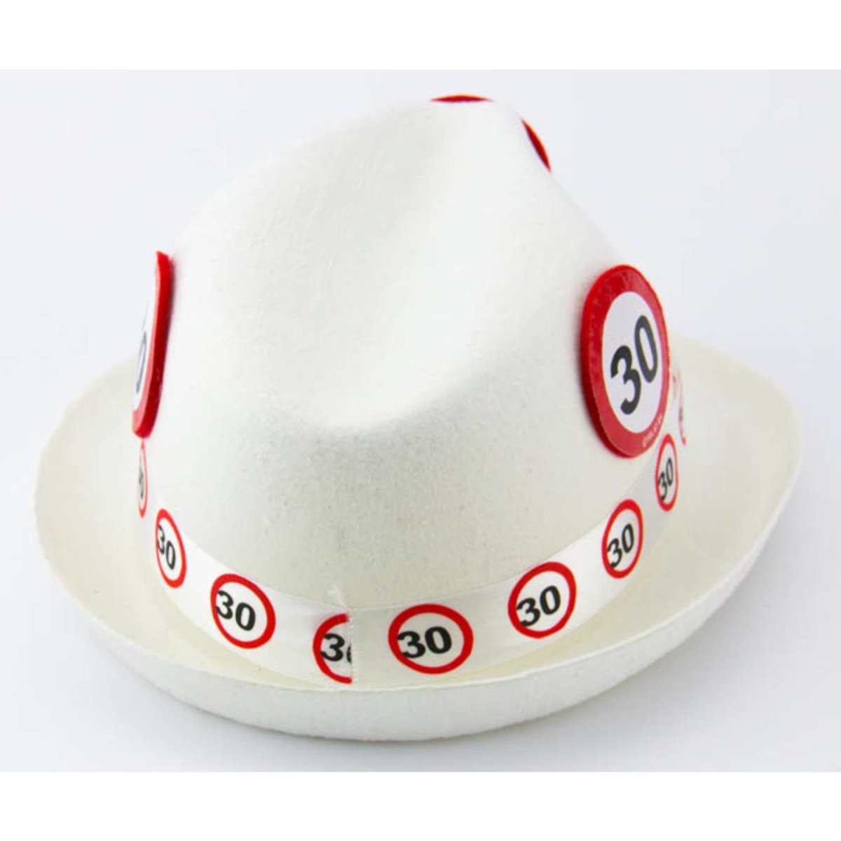 30 Year Traffic Sign Trilby Hat White. Zawartość: 1 czapka, kolor: biały. Do wykorzystania na przykład podczas następujących imprez: Karnawał, Impreza tematyczna, Halloween. Kapelusz ma 23 cm szerokości i 37 cm wysokości. Artykuł jest wykonany z poliestru.