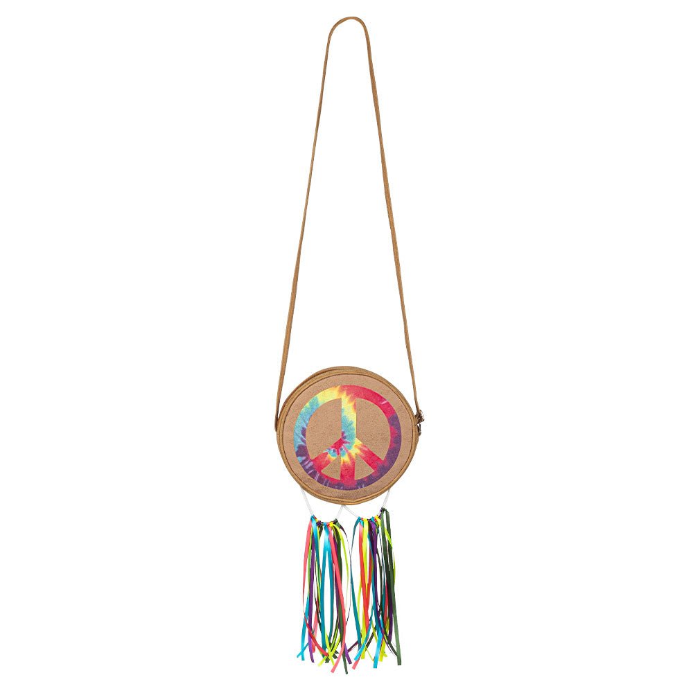 Cofnij się do lat flower power dzięki tej kolorowej torbie na ramię w stylu hippie. Okrągły wzór ze znakiem pokoju i wesołymi wstążkami nadaje każdemu strojowi zabawny klimat retro lat 70. Idealna na festiwale, imprezy tematyczne lub letnie dni.