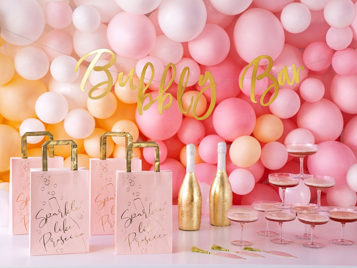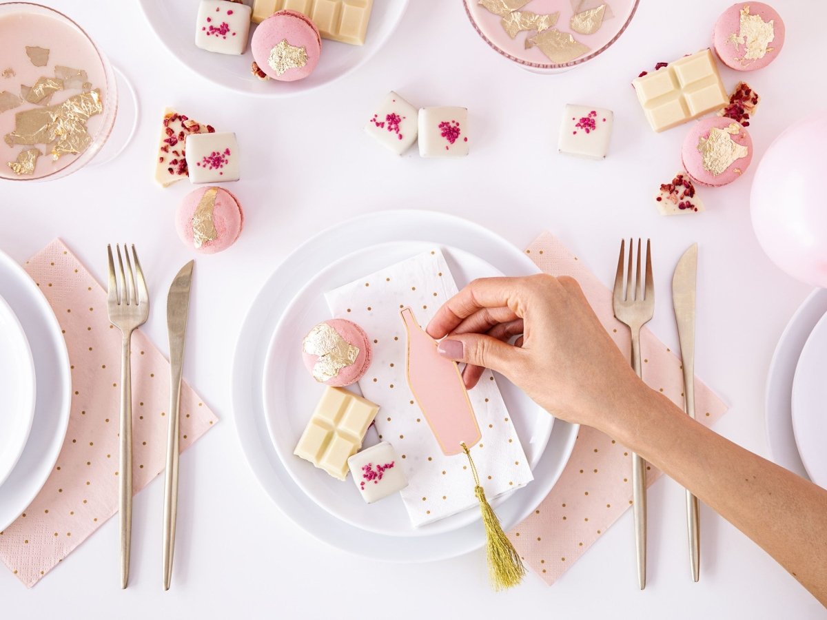 Zawartość: Wizytówki z papieru w kolorze różowym ze złotym metalicznym nadrukiem i złotym sznurkiem do czytania, rozmiar butelki ok. 3,5 x 10 cm, rozmiar butelki z frędzlem ok. 3,5 x 16 cm. (1 PKT/6 szt.)