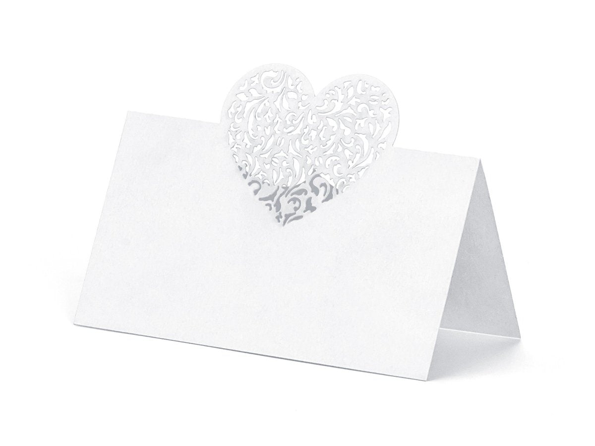 Zawartość: Place Cards Heart, wykonane z perłowego białego papieru, z wyciętym ornamentem, rozmiar 9x6,5cm. (1 szt./10 szt.)