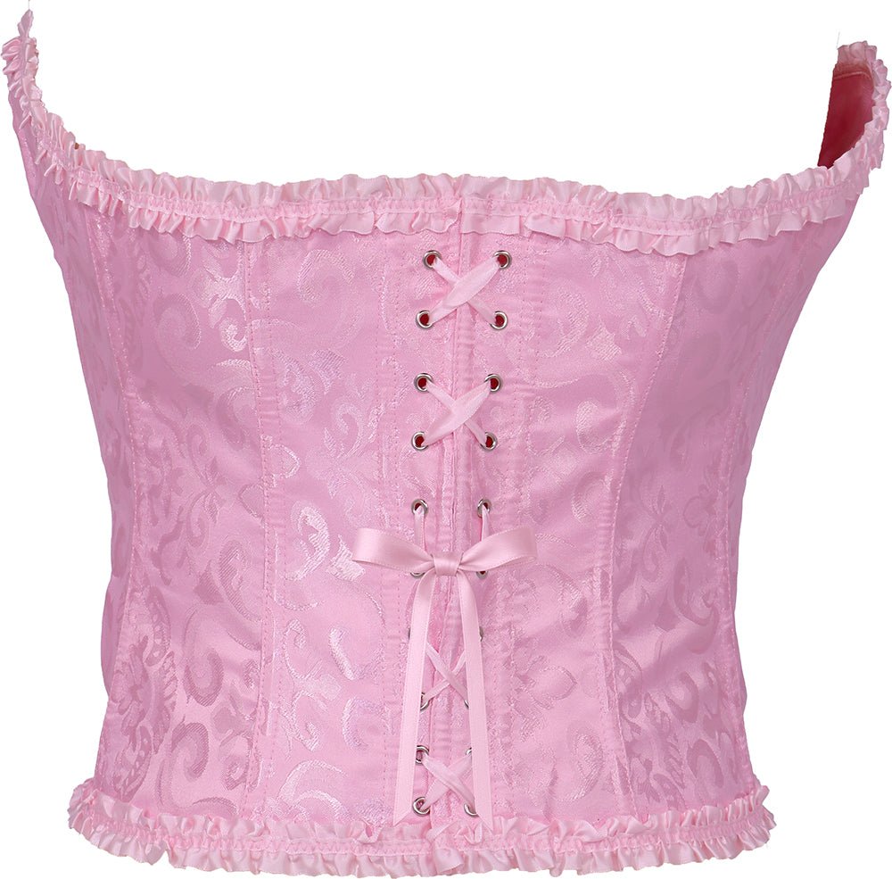 Nadaj swojemu wyglądowi delikatny, ale efektowny wygląd dzięki temu różowemu gorsetowi damskiemu. Dzięki wytrzymałemu poliestrowi i eleganckiemu wykończeniu, ten gorset jest idealny do strojów imprezowych, zestawów bielizny i cosplay.