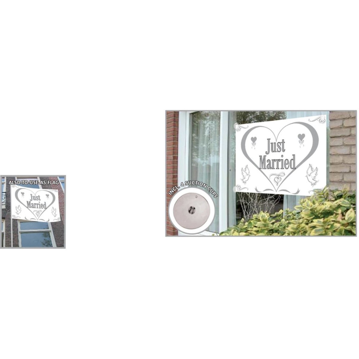 Flaga Just Married 100x150cm. Zawartość: 1 flaga. Do wykorzystania na przykład podczas następujących przyjęć/imprez okolicznościowych: Ślub. Artykuł ma wymiary 100 x 50 cm. Artykuł jest wykonany z poliestru.