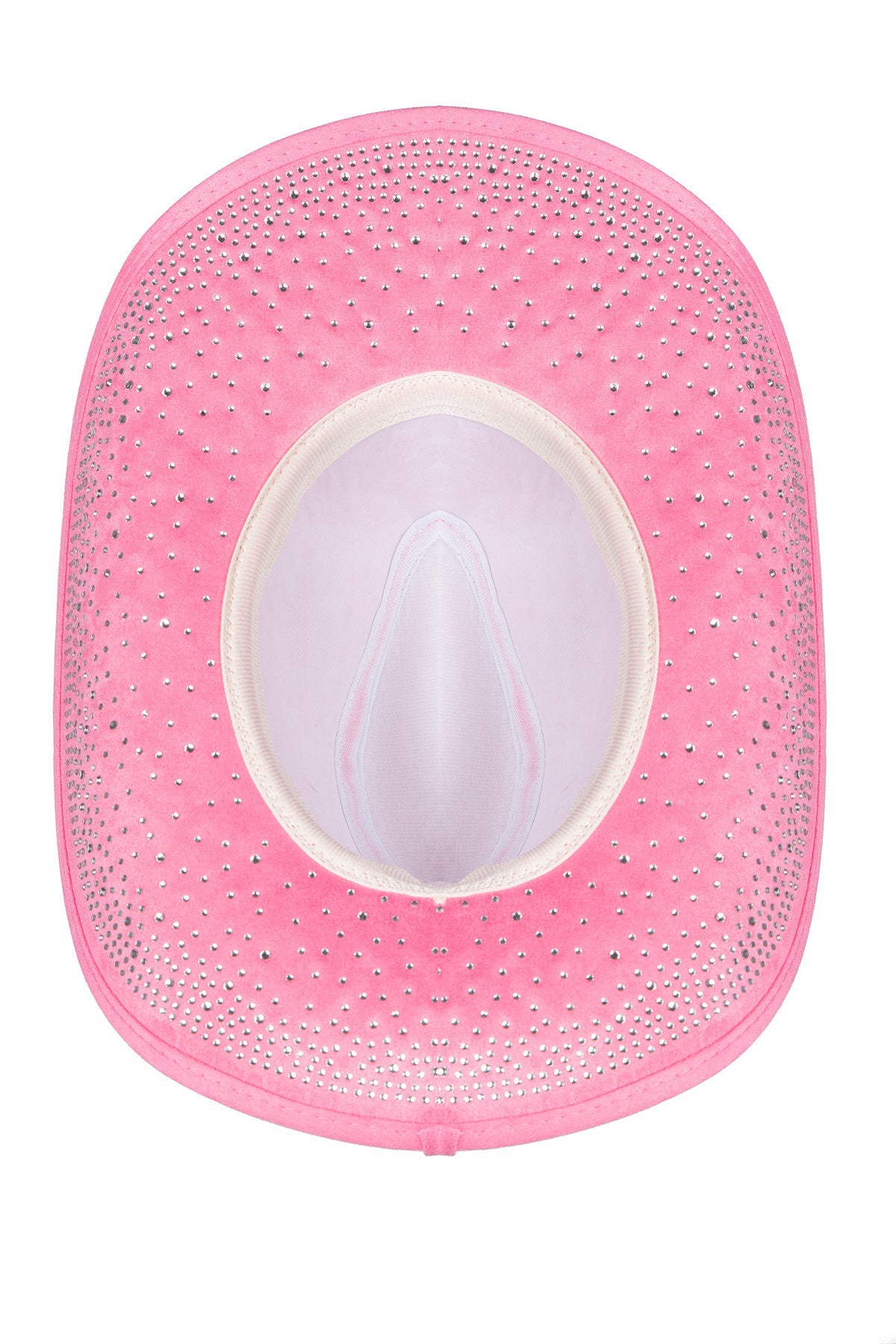 Przyciągający wzrok różowy kapelusz kowbojski ozdobiony błyszczącymi kryształkami. Idealny jako dodatek na imprezy tematyczne, przebierane lub festiwale.