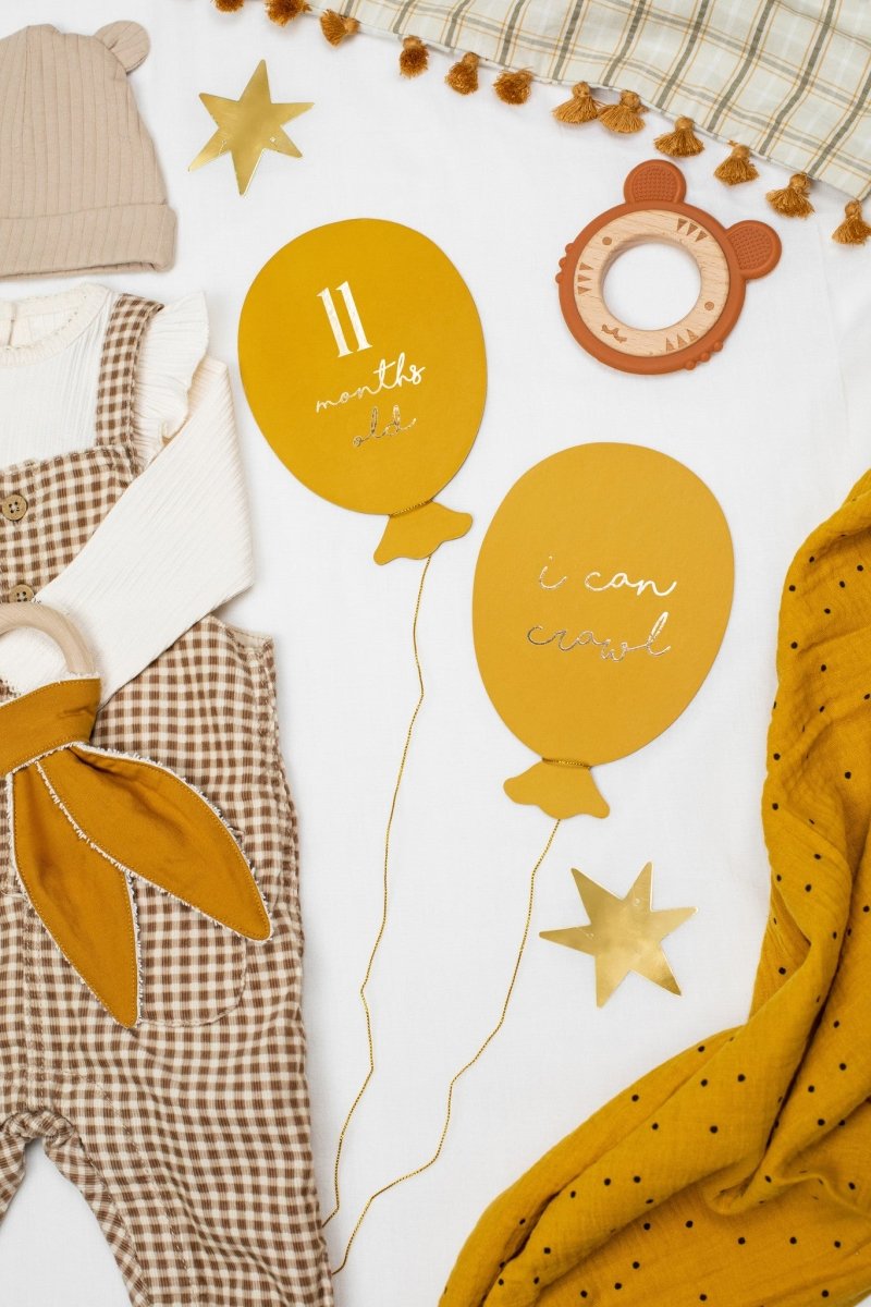Karty do zdjęć Balony, mix kolorów, zestaw zawiera 12 kart w kształcie balonów z metalicznym nadrukiem i 300 cm złotym sznurkiem, rozmiar karty to około 11,5 x 17 cm.