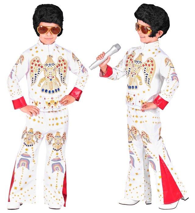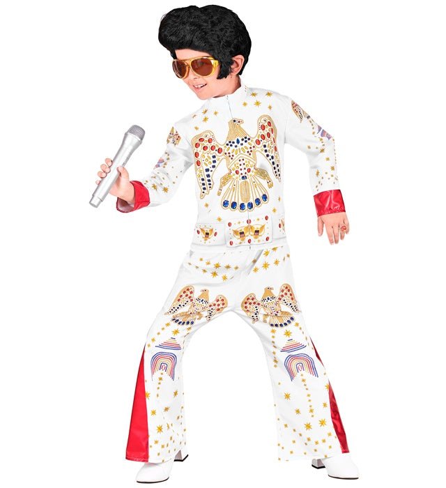 Pozwól swojemu dziecku zabłysnąć jak prawdziwa gwiazda rock and rolla w tym kostiumie Króla Rocka, inspirowanym Elvisem. Przyciągające wzrok kolory biały, czerwony i złoty tworzą ikoniczny wygląd. Idealne na karnawał, Halloween, koncert lub imprezę tematyczną.