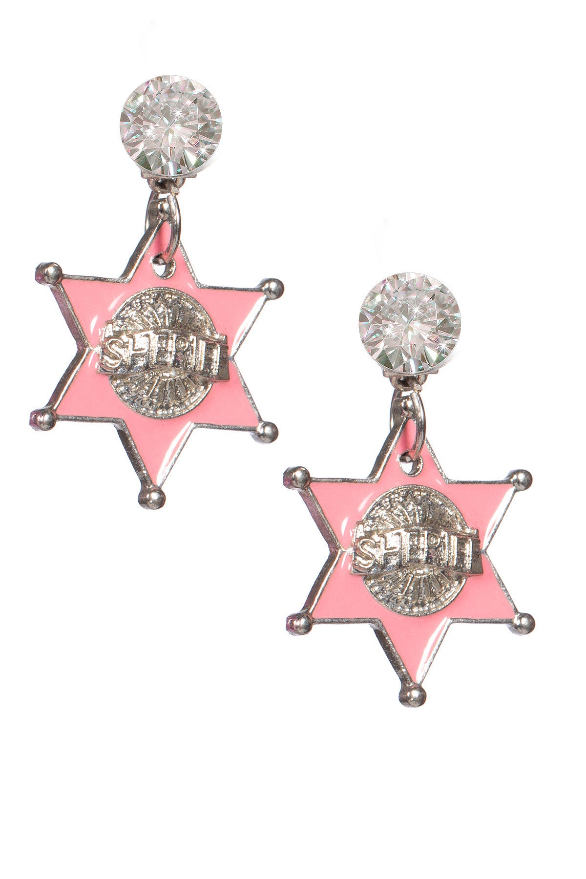 Urocze kolczyki w kształcie gwiazdy szeryfa w kolorze srebrnym i różowym. Idealne jako dodatek na imprezy tematyczne, przebierane lub do strojów westernowych.