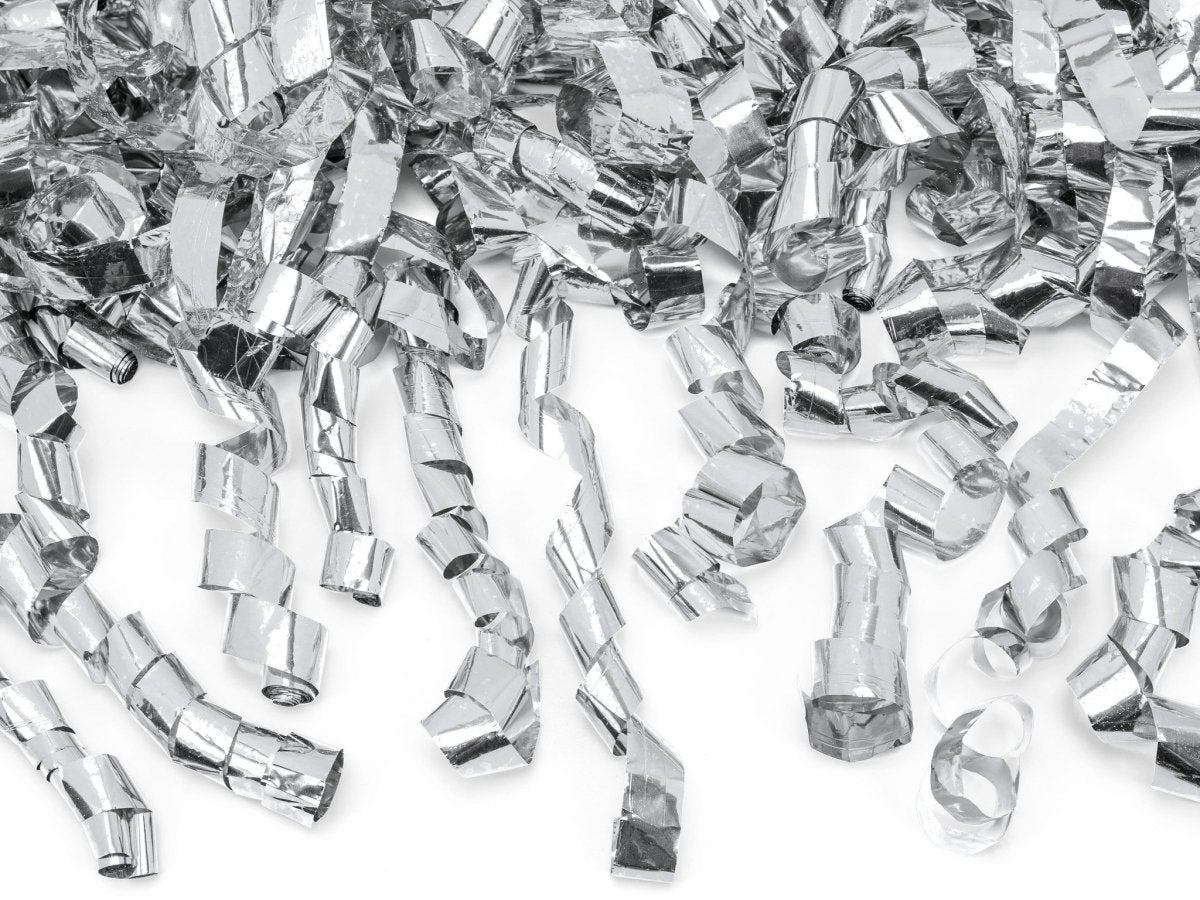 Zawartość: Armatka Konfetti wystrzeliwująca długie srebrne metaliczne serpentyny o długości 80 cm.