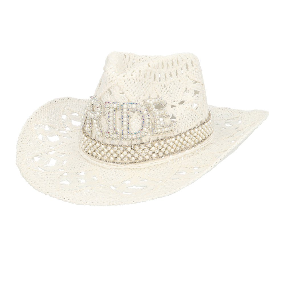 Dla panny młodej, która kocha naturalny wygląd z odrobiną glamour: Kapelusz Cowboy Summer "Bride" to stylowy wybór na wieczory panieńskie boho lub festiwalowe wesele. Wykonany z lekkiego i przewiewnego plecionego materiału, elegancki i wygodny, ma błyszczące litery "BRIDE" i delikatną perłową opaskę, która subtelnie się mieni.