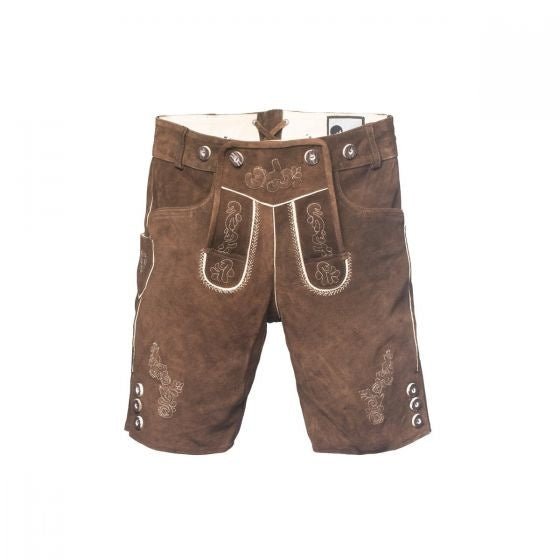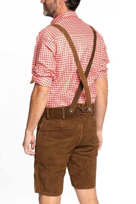 Wybierz się na Oktoberfest w tradycyjnym stylu dzięki tym klasycznym lederhose z szelkami. Krótki model zapewnia autentyczny wygląd, oferując jednocześnie wysoki komfort. Ciepły brązowy kolor i wytrzymała skóra sprawiają, że te lederhosen to trwały i stylowy wybór na świąteczne okazje.