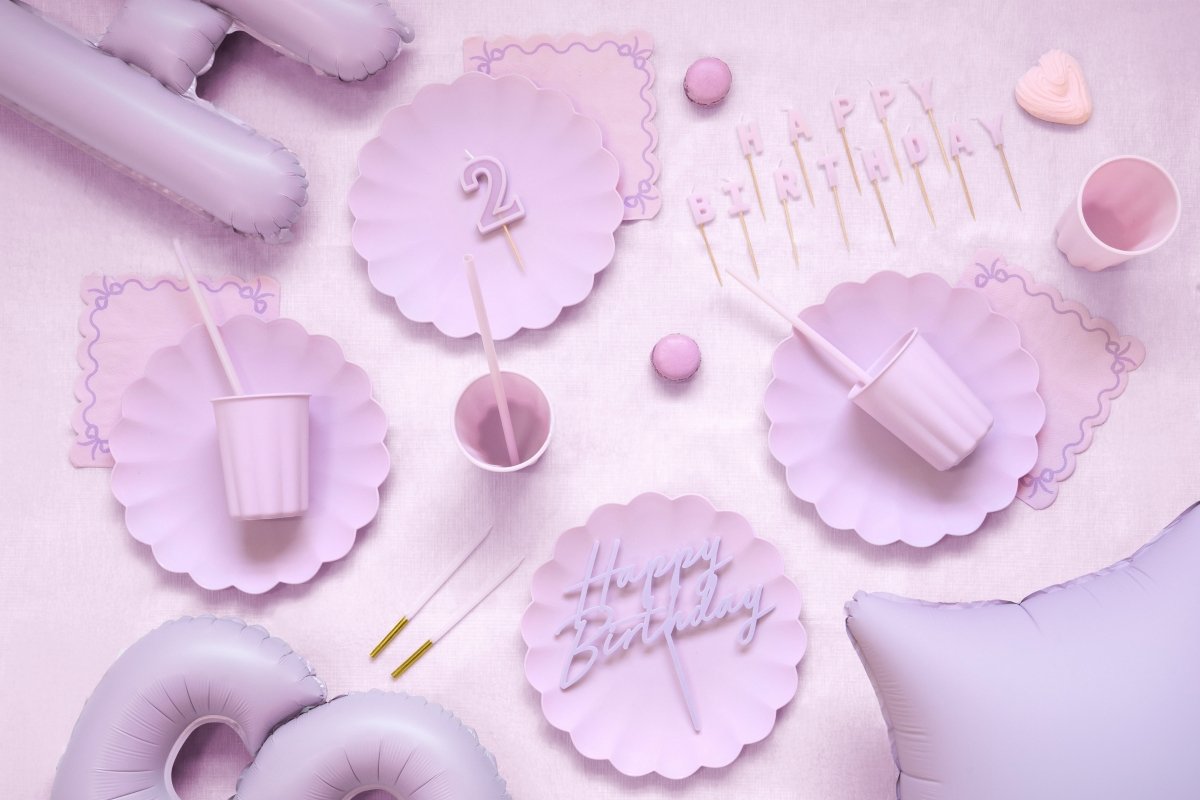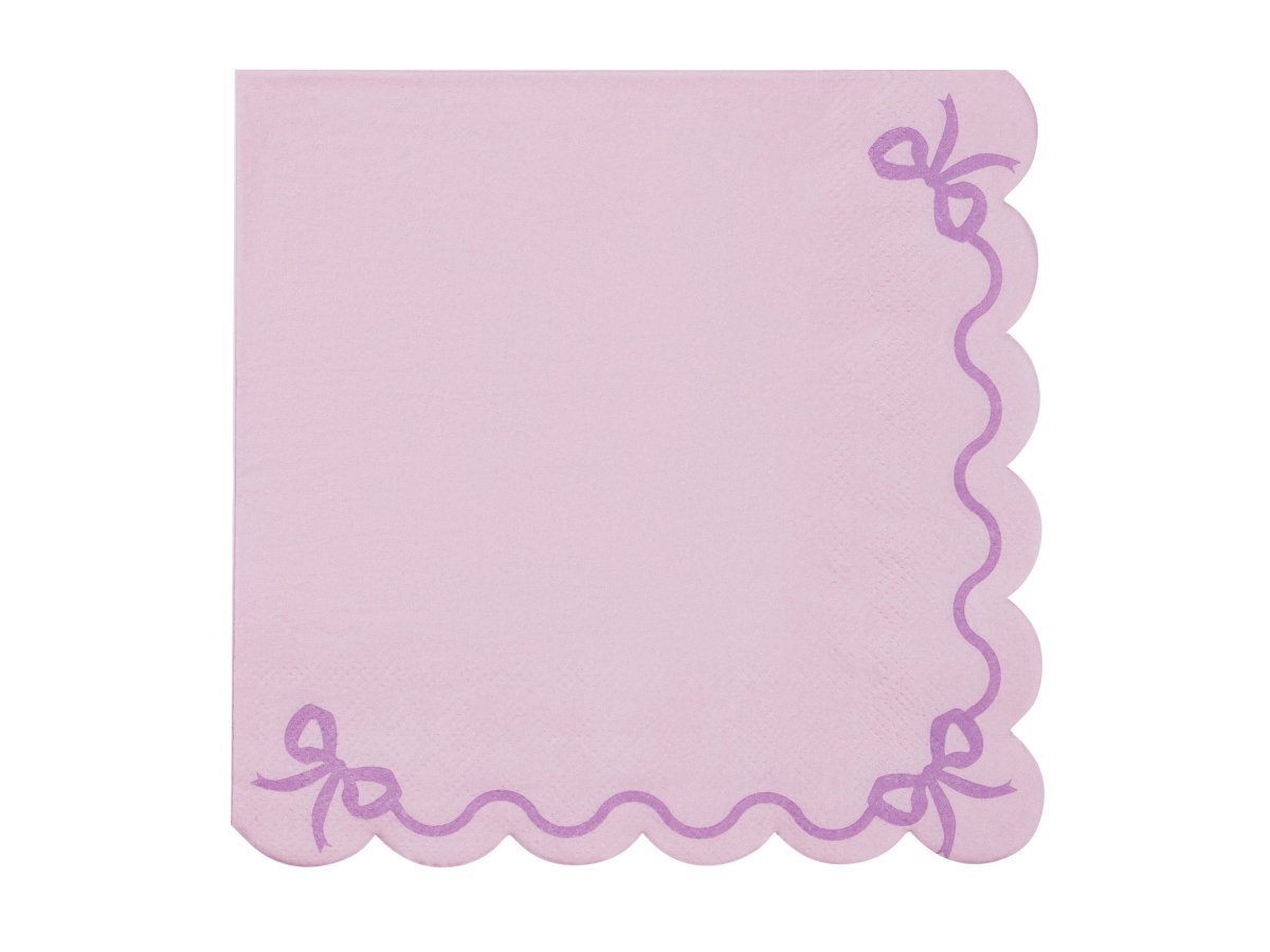 Papierowe serwetki w kolorze fioletowym wykończone frędzlami. Nadruk wstążki z kokardką na serwetkach. Wymiary po rozłożeniu ok. 33 x 33 cm, wymiary po złożeniu ok. 16,5 x 16,5 cm. 12 sztuk.