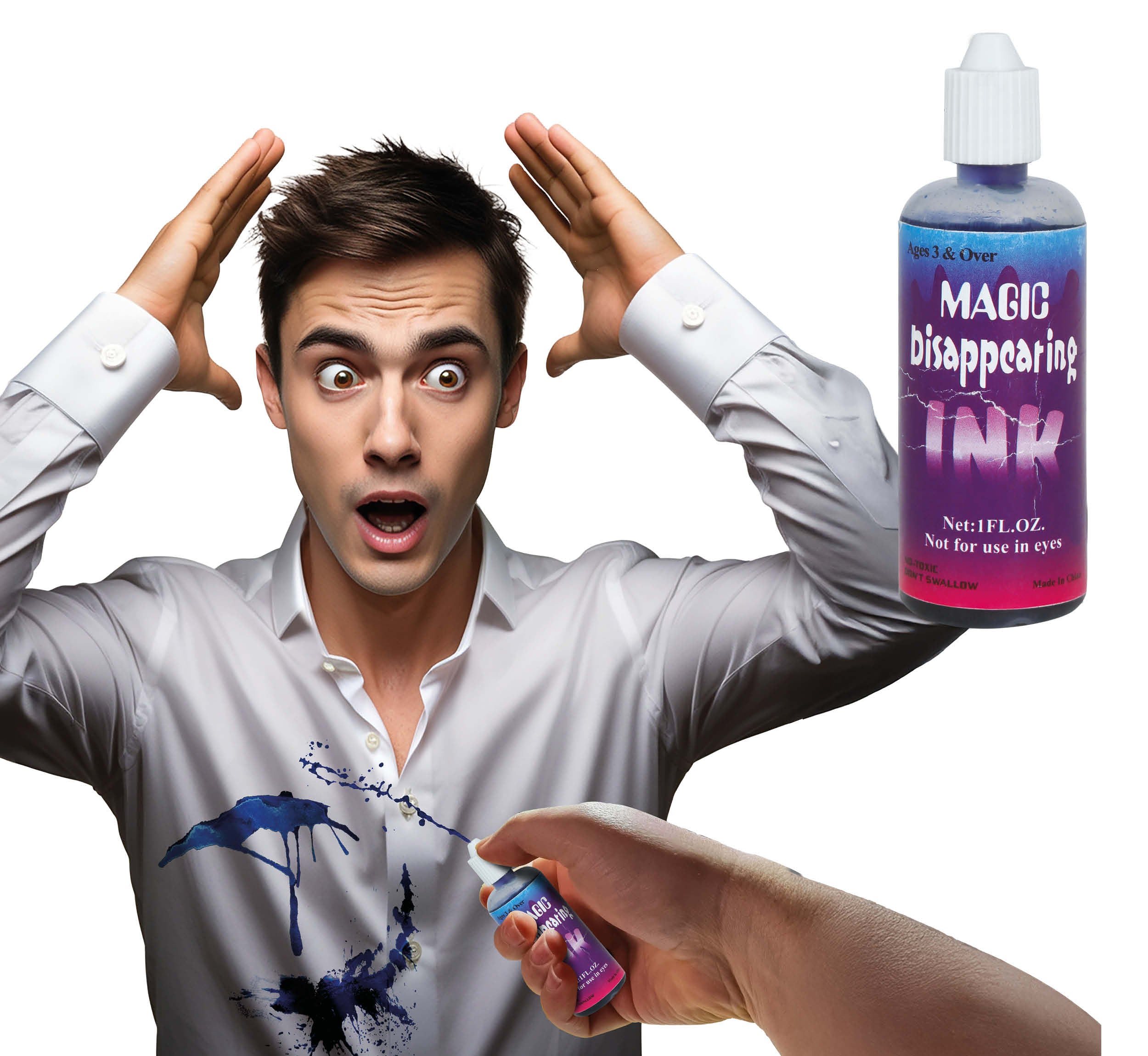 Zaskocz swoich znajomych tym przezabawnym Magic Ink Prank! Niebieski "magiczny atrament" pozostawia realistyczną plamę, gdy tylko kapniesz nim na papier lub ubranie, ale... po krótkim czasie plama znika sama! Idealny do zabawnych momentów, humorystycznych sytuacji i jako lekki prezent.