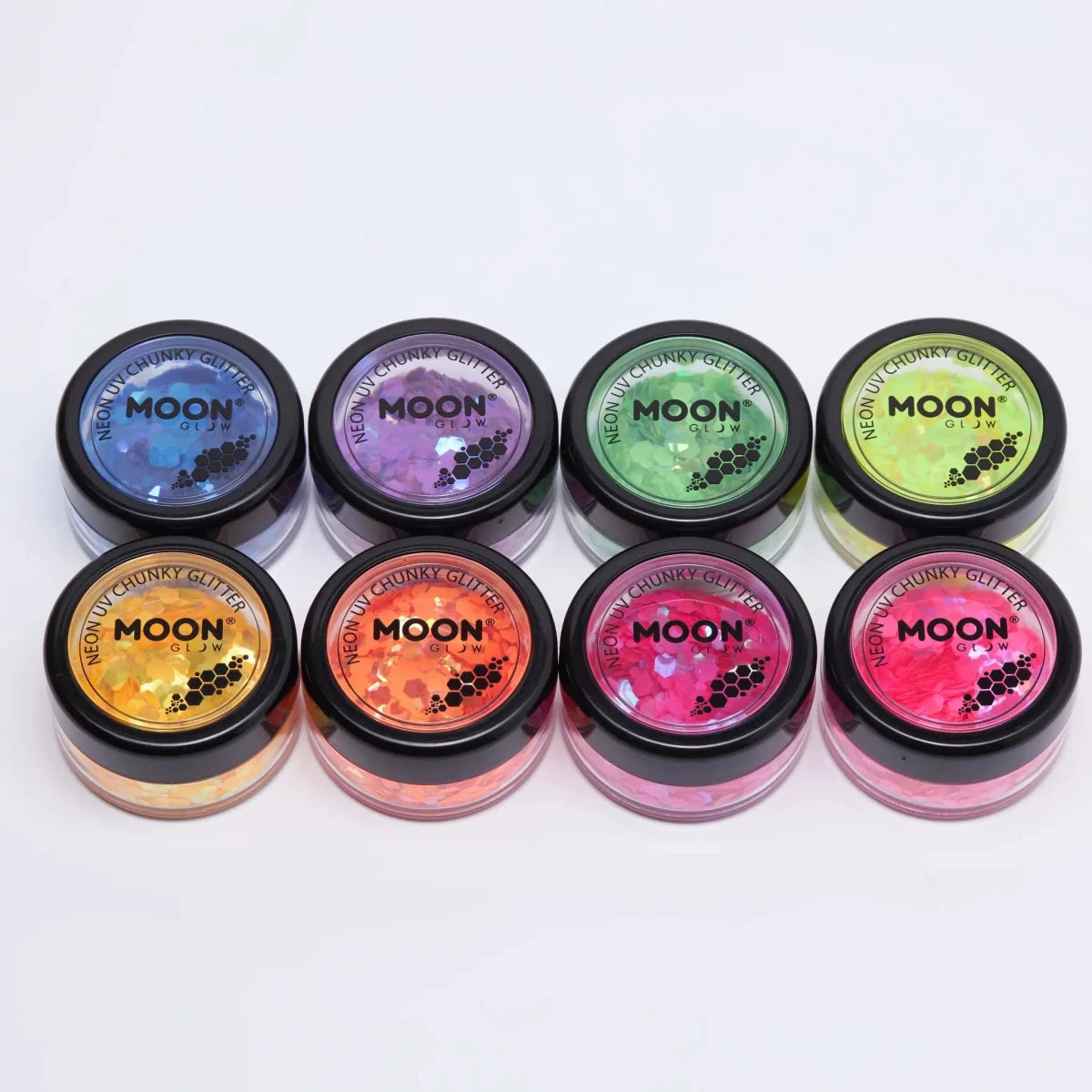 Moon Glow Intense Neon UV Chunky Glitters są niezbędne do tworzenia efektownych stylizacji, które świecą neonowym blaskiem w dzień i świecą w nocy pod lampami UV lub czarnymi światłami. Gdziekolwiek jesteś - ich gwiazdorska jakość kradnie show!