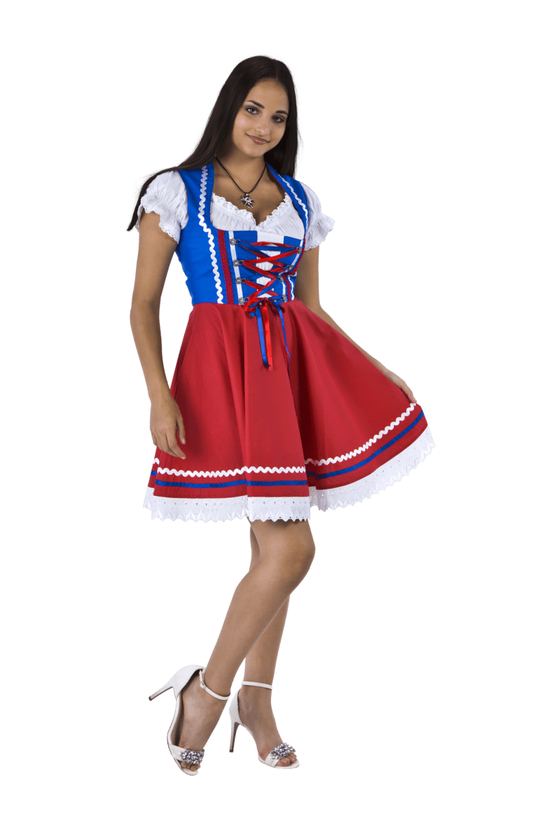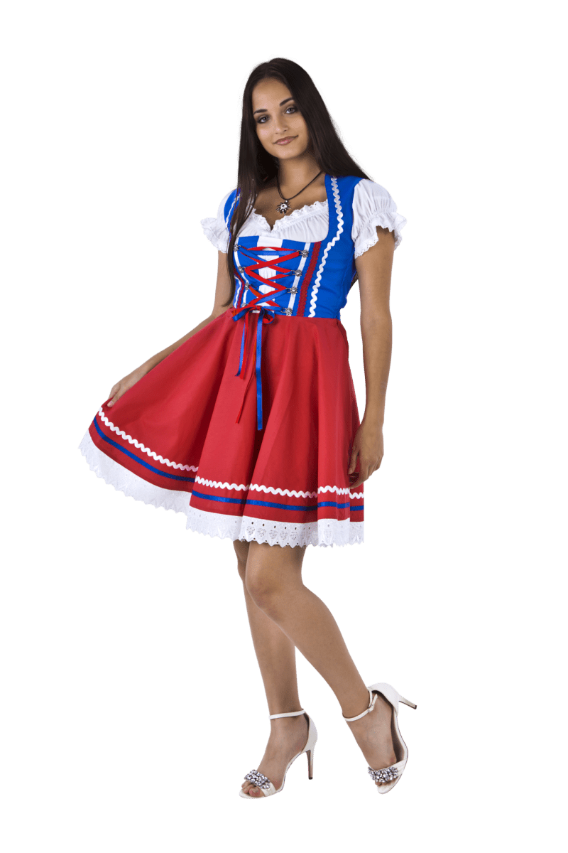 Mini dirndl, 2-częściowy, w tym sukienka i regulowana bluzka Carmen w kolorze białym, oba wykonane w 100% z bawełny. W pełni podszyta. W tym gorset z satynową tasiemką. Sukienka ozdobiona różnymi i wykończona białą koronką na dole spódnicy. Jedna wsuwana kieszeń w spódnicy z koła i zamek błyskawiczny YKK. Długość spódnicy ok. 50 cm (rozmiar 34-46), długość spódnicy 55 cm (rozmiar 48-52). Wykonana z wysokiej jakości materiałów. Nasza modelka ma 1,65 m wzrostu i nosi rozmiar 36. Dostępna w rozmiarach od 34 do 46.
