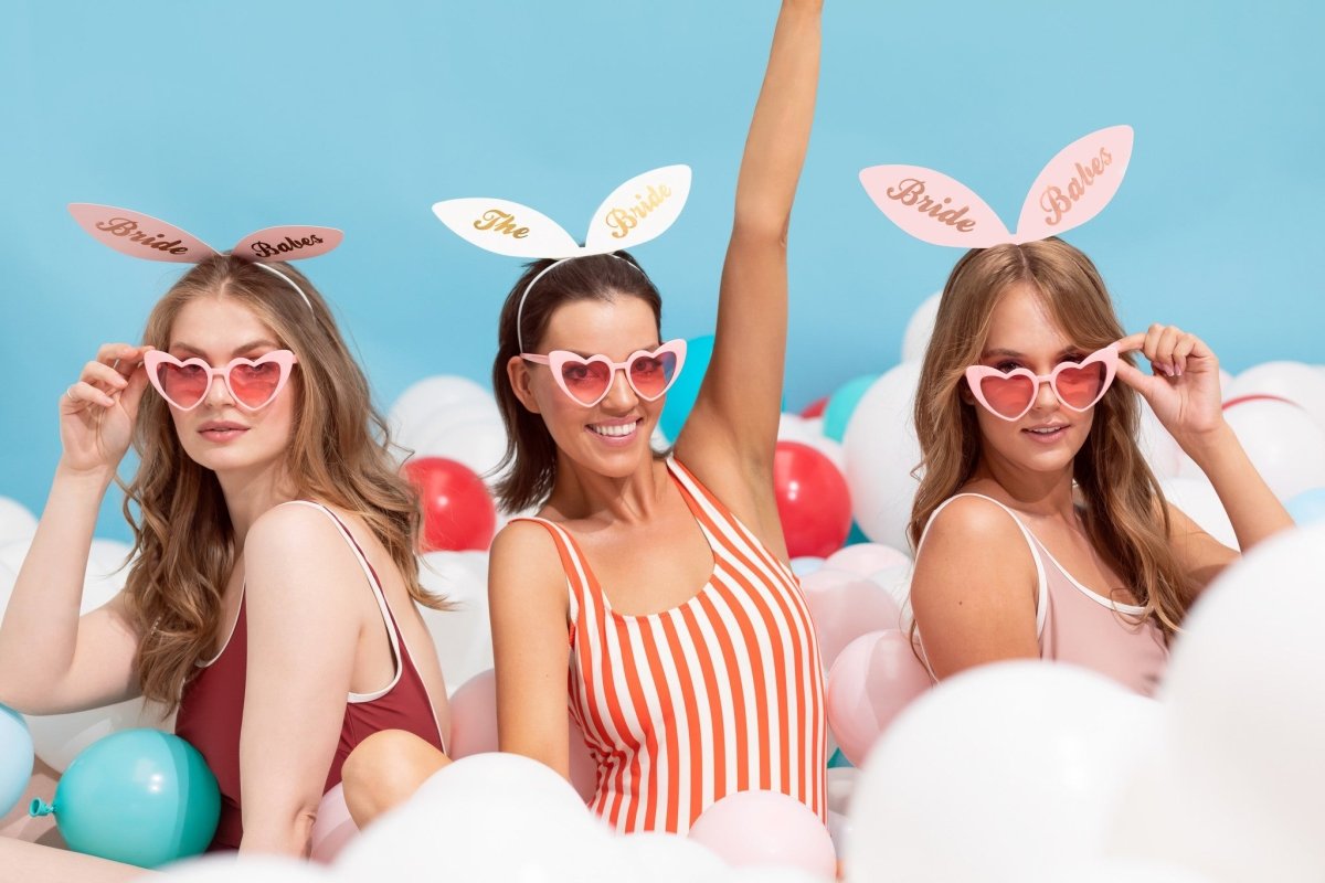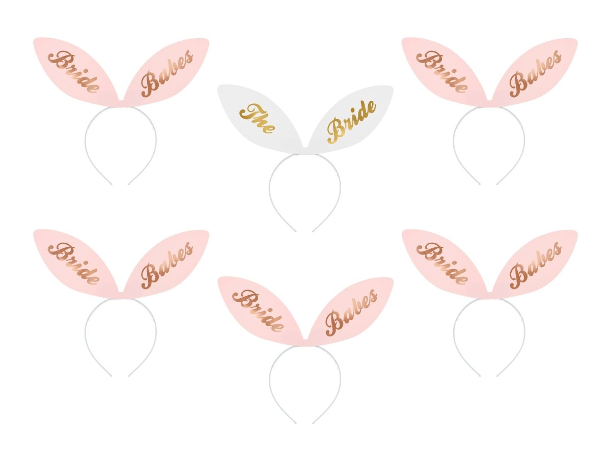 Zestaw 6 opasek do włosów z uszami Bride Squad, 5 różowych opasek do włosów z napisem "Bride Babes" i 1 biała opaska do włosów z napisem "The Bride". Rozmiar około 29x25 cm.