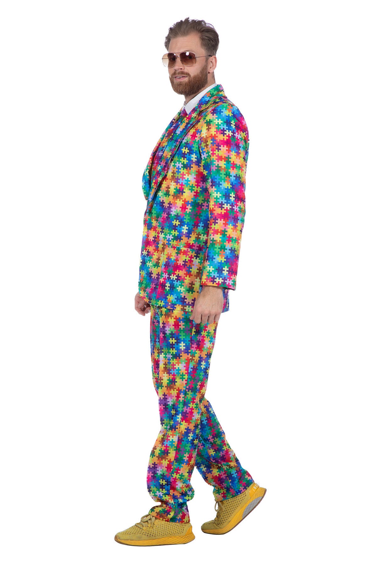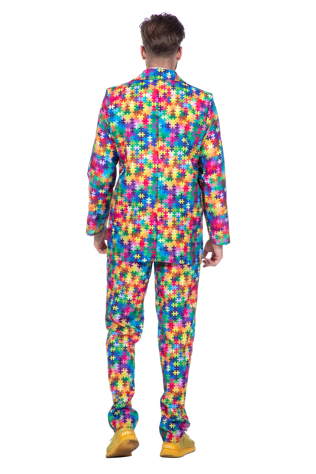Przyciągający wzrok męski garnitur z nadrukiem puzzli w wielu kolorach, w tym spodnie, marynarka i krawat. Idealny na imprezy tematyczne, karnawałowe lub przebierane.