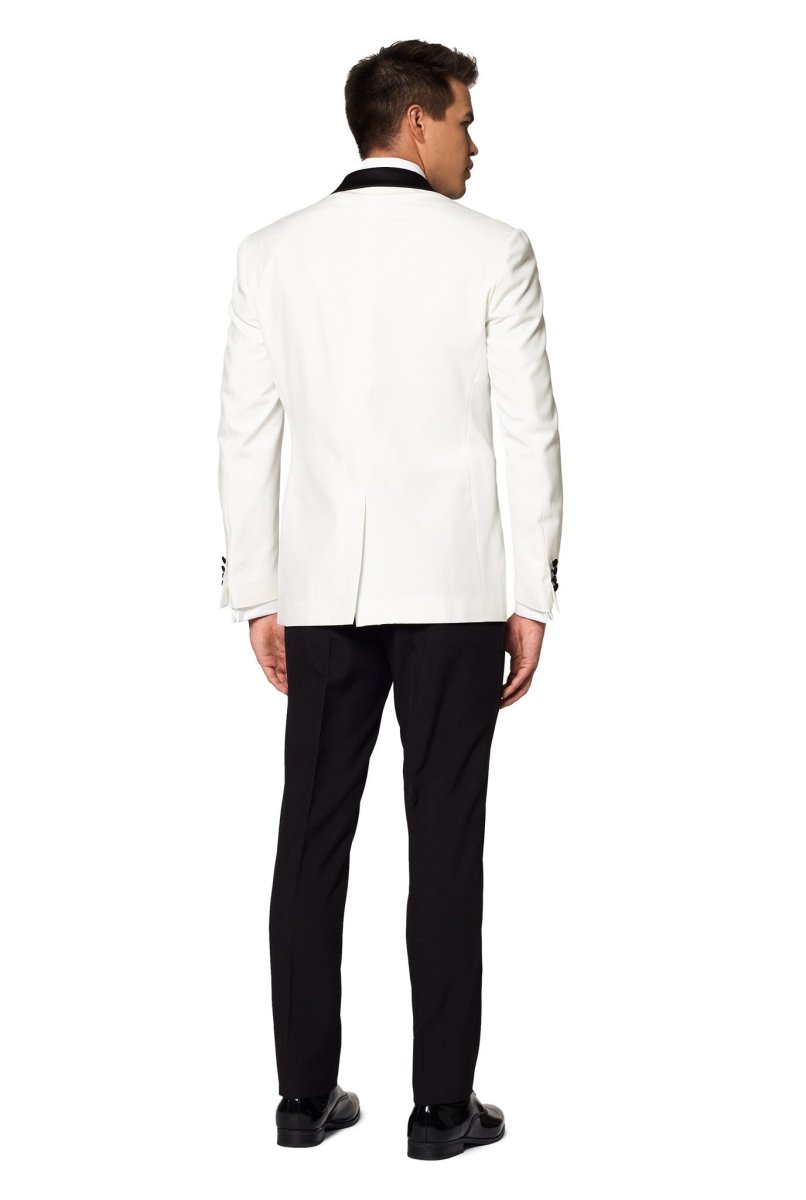 Biaława marynarka smokingowa w połączeniu z czarnymi spodniami z podwójną plisą i muszką to jedna z najbardziej eleganckich opcji stroju formalnego, która pozwoli Ci wyróżnić się stylem. Nadaje się na imprezy typu black tie, formalne okazje w ciągu dnia i letnie formalne okazje. Smoking Parly White ma satynowe klapy i nowoczesny krój.