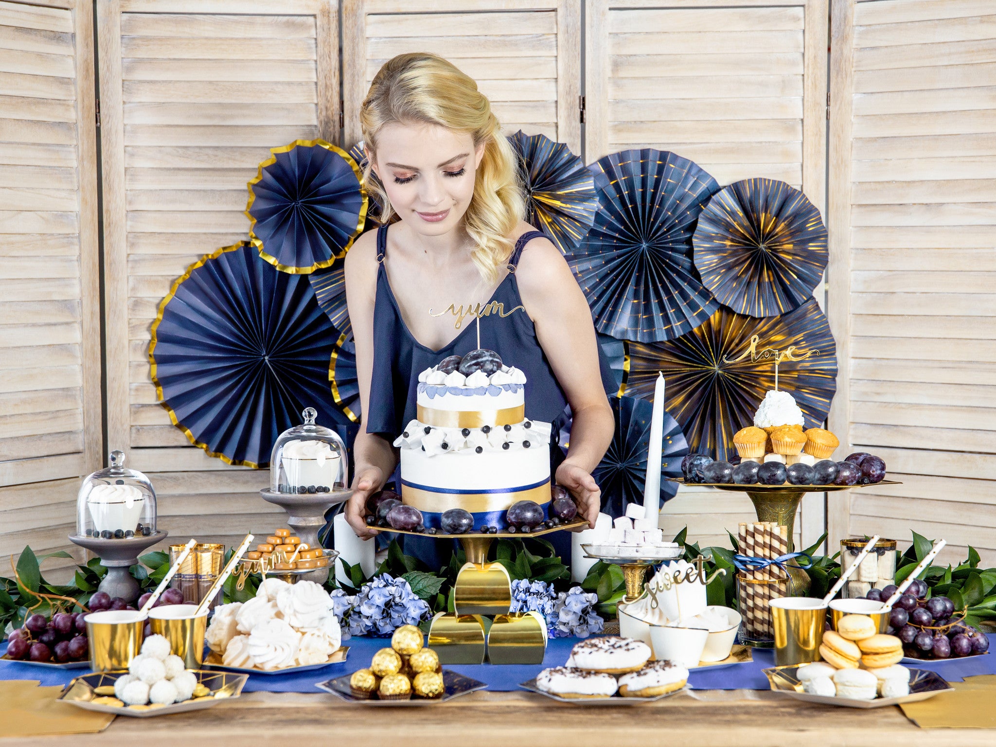 Zawartość: Kratki ozdobne, granatowe ze złotymi wzorami, średnice po złożeniu ok. 23 cm (2 sztuki), 32 cm (1 sztuka) i 40 cm (1 sztuka). (1 PKT / 4 st.)