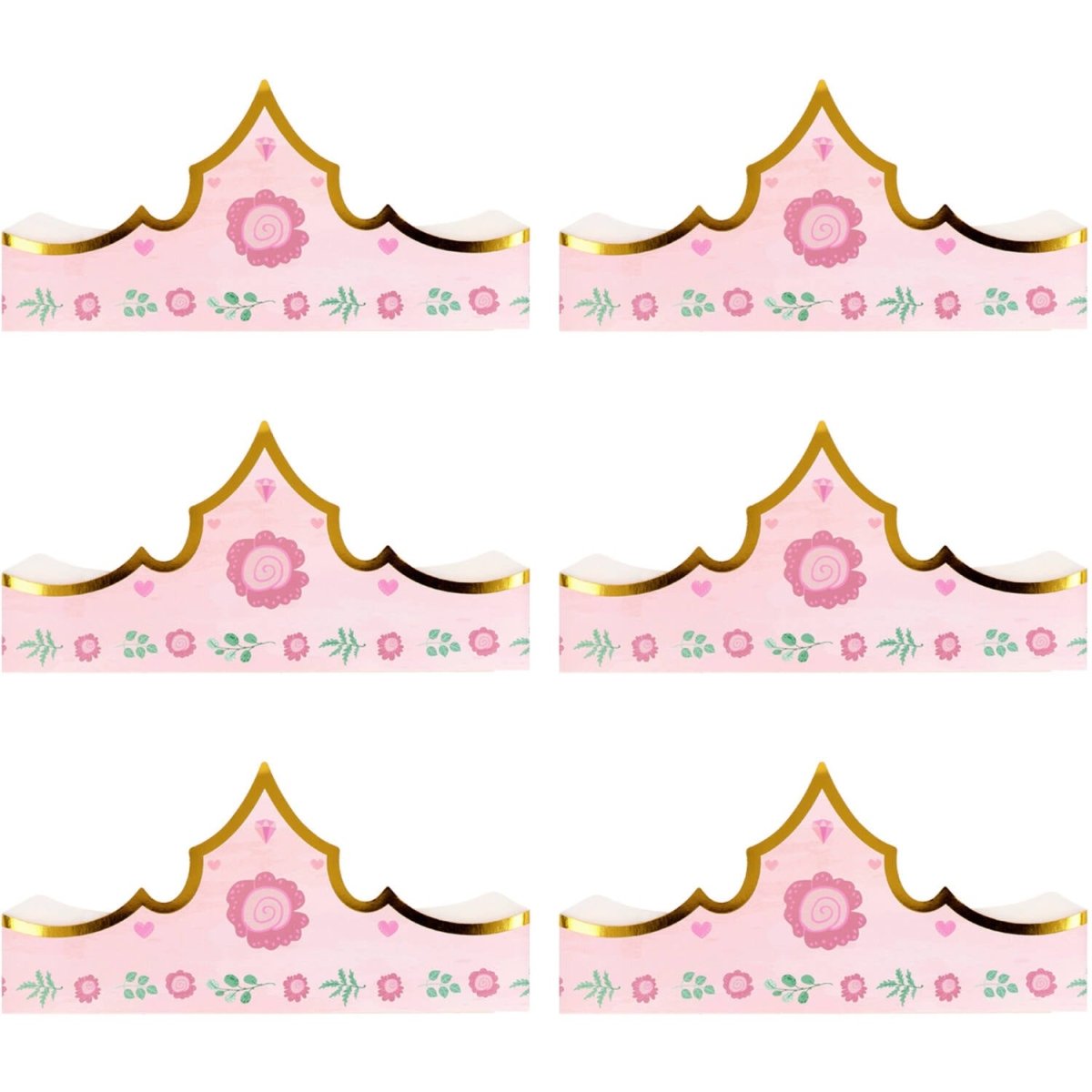 Tylko dla prawdziwych księżniczek. Korony - Pretty Princess - 6 sztuk. Zawartość: 6 papierowych koron. Do wykorzystania na przykład podczas następujących przyjęć/imprez: Przyjęcie dla dzieci, Urodziny, Impreza tematyczna. Jasnoróżowe papierowe korony ze słodkimi kwiatuszkami i prawdziwie błyszczącą złotą krawędzią dzięki zastosowanej technice tłoczenia na gorąco. Korony mają około 10 cm wysokości i 60 cm długości. Korony księżniczek można łatwo dopasować do rozmiaru. Te korony należą do kolekcji Pretty Princess od