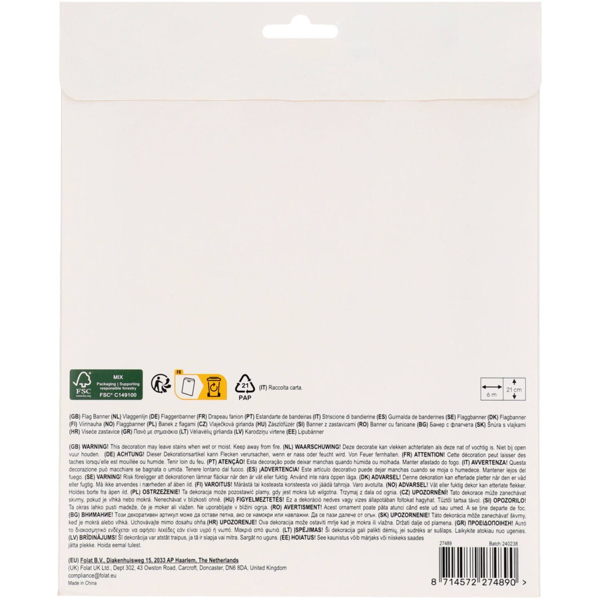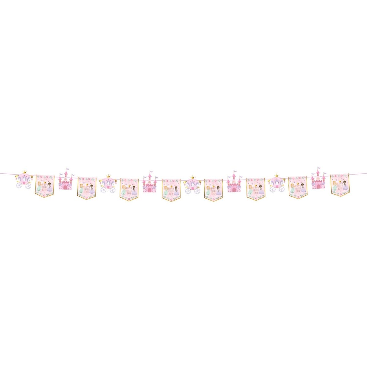 Na czarujące przyjęcia dla księżniczek. Sznur flagowy - Pretty Princess - 6 metrów. Zawartość: 1 linka flagowa. Do wykorzystania na przykład podczas następujących przyjęć/imprez: Przyjęcie dla dzieci, Urodziny. To będzie naprawdę przyjęcie dla księżniczek! Na tej 6-metrowej lince znajduje się 16 flag o wymiarach około 17 x 21 cm. Są 3 rodzaje flag: różowa flaga z napisem "HAPPY BIRTH DAY" i dwie księżniczki, jedna w kształcie zamku, a druga w kształcie karety. Wszystkie flagi mają piękne złote detale, które naprawdę błyszczą dzięki zastosowanej technice tłoczenia na gorąco! Flagi są drukowane po obu stronach. Można je przesuwać tam i z powrotem po różowej wstążce. Ta linia flag należy do kolekcji Pretty Princess autorstwa