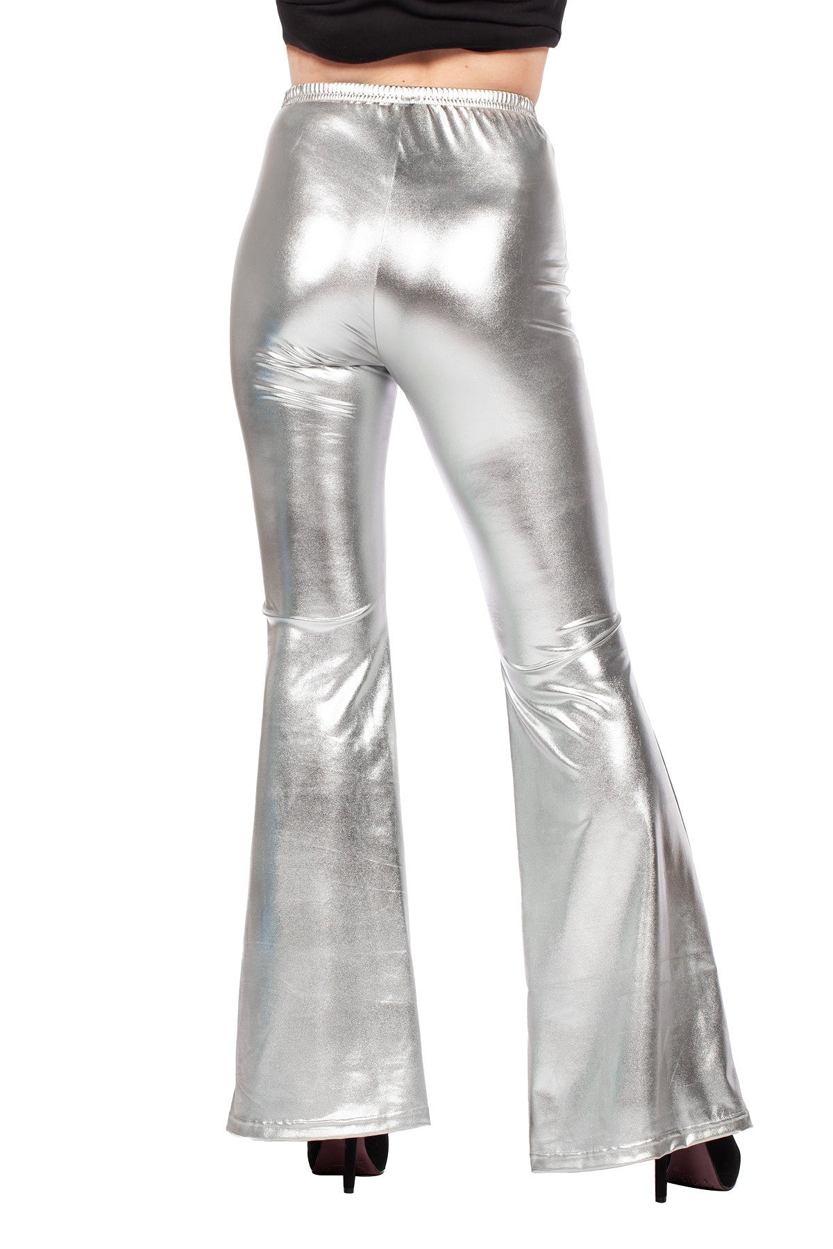 Dodaj efektowny akcent do swojego stroju dzięki tym srebrnym rozkloszowanym legginsom. Idealne na imprezy, festiwale lub wieczory tematyczne w stylu retro.