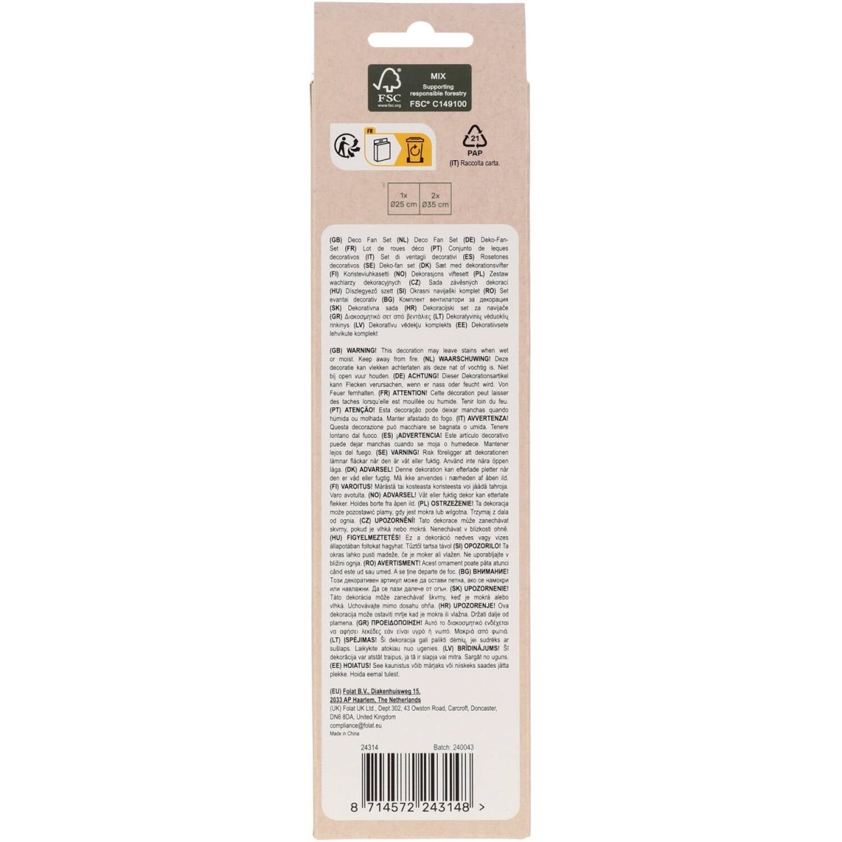 Świętuj na różowo! Zestaw wachlarzy Deco - Perfect Pink - 3 szt. Zawartość: 3 wentylatory dekoracyjne. Na przykład do wykorzystania podczas następujących przyjęć/imprez okolicznościowych: Urodziny, Impreza tematyczna, Narodziny dziewczynki. Czarujące różowe wachlarze dekoracyjne z różnymi wzorami w czterech odcieniach różu. Istnieją dwa duże o średnicy 35 cm: pasiasty w 2 odcieniach różu i jeden z 3 odcieniami różu. Plus mniejszy rozmiar o średnicy 25 cm: 2 odcienie różu. Wentylatory są pakowane po złożeniu i można je łatwo rozłożyć przed użyciem. Do każdego wentylatora dołączony jest bawełniany sznurek służący do zawieszenia wentylatora. Ze spinaczami do papieru, aby utrzymać wentylatory w okrągłym kształcie. Wydruk dwustronny. Ten przedmiot jest wykonany z papieru FSC.