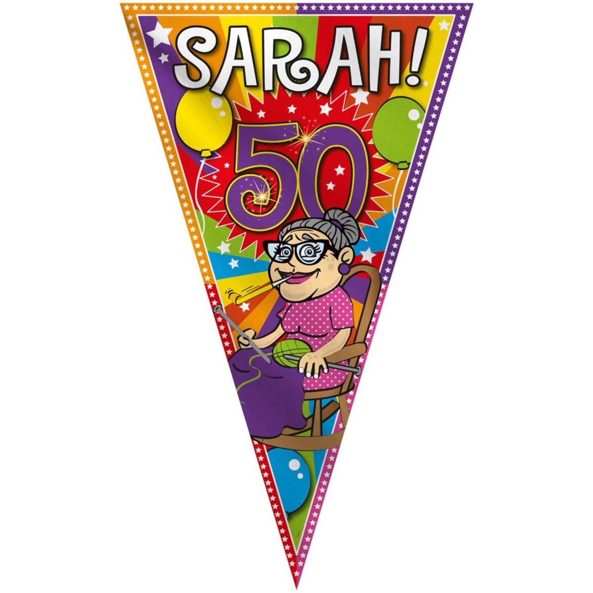50 Years Sarah Party Mega Flaga 100x150. Zawartość: 1 flaga. Kolor: wielokolorowa. Do wykorzystania na przykład podczas następujących przyjęć/imprez okolicznościowych: Impreza tematyczna, Urodziny. Wymiary tego artykułu: 100x150cm. Ten artykuł jest wykonany z poliestru.