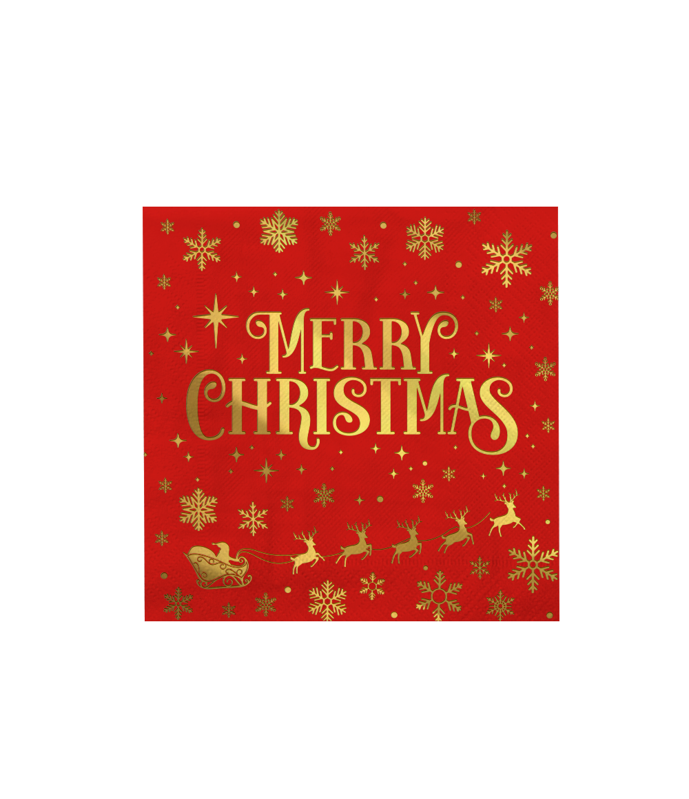 Uzupełnij świąteczny stół tymi stylowymi czerwonymi serwetkami ze złotym nadrukiem Wesołych Świąt. Serwetki są wykonane z papieru i natychmiast dodadzą świątecznej atmosfery do każdej świątecznej kolacji, brunchu lub drinków