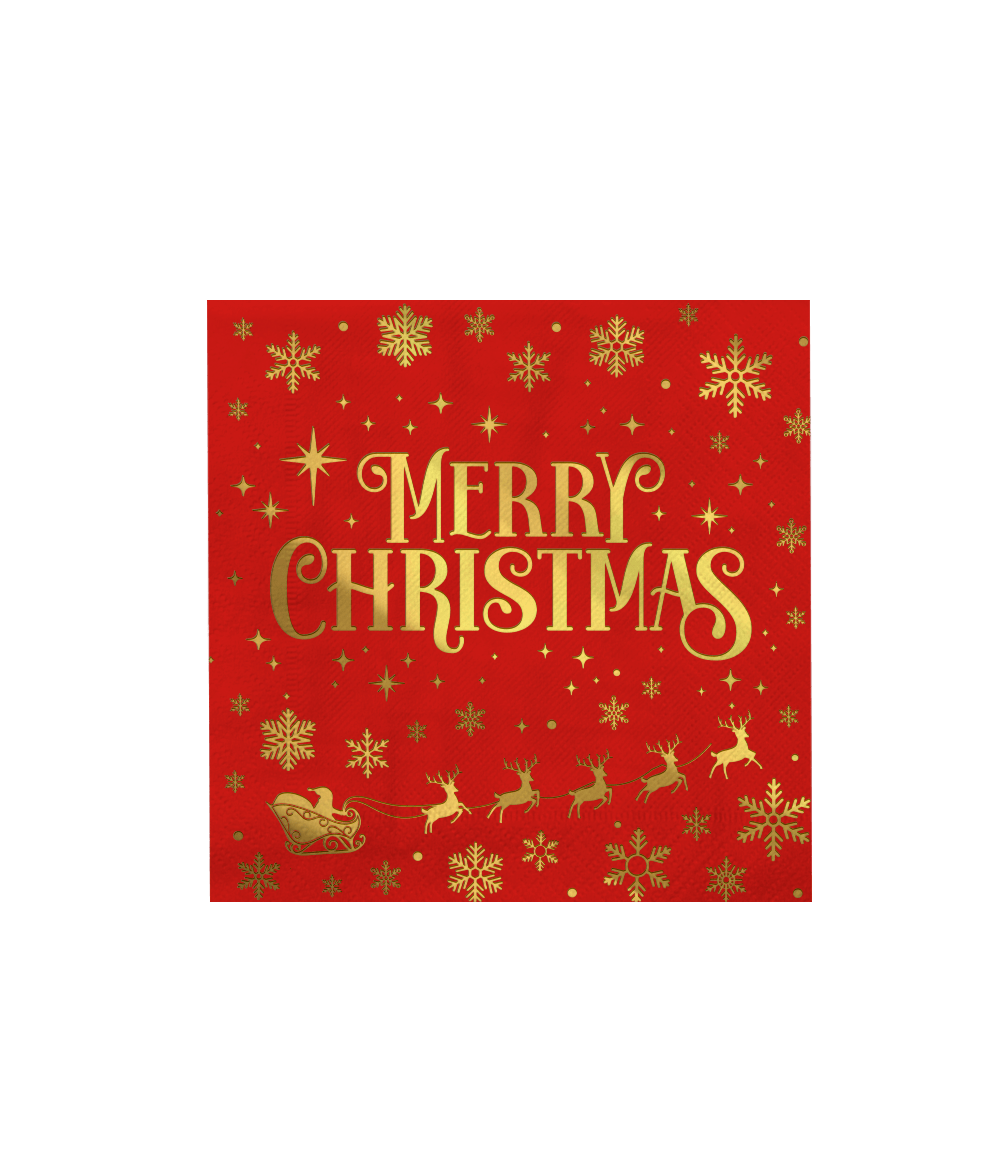 Uzupełnij świąteczny stół tymi stylowymi czerwonymi serwetkami ze złotym nadrukiem Wesołych Świąt. Serwetki są wykonane z papieru i natychmiast dodadzą świątecznej atmosfery do każdej świątecznej kolacji, brunchu lub drinków
