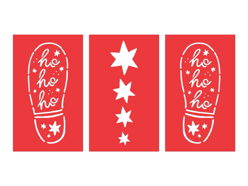 Papierowe szablony - odcisk stopy Mikołaja i gwiazdki, zestaw zawiera 3 różne wzory w kolorze czerwonym. Rozmiar każdego szablonu ok. 16,5 x 27,5 cm.(1 sztuka / 3 sztuki) Materiał: Papier niepowlekany folią i nielakierowany - 100%