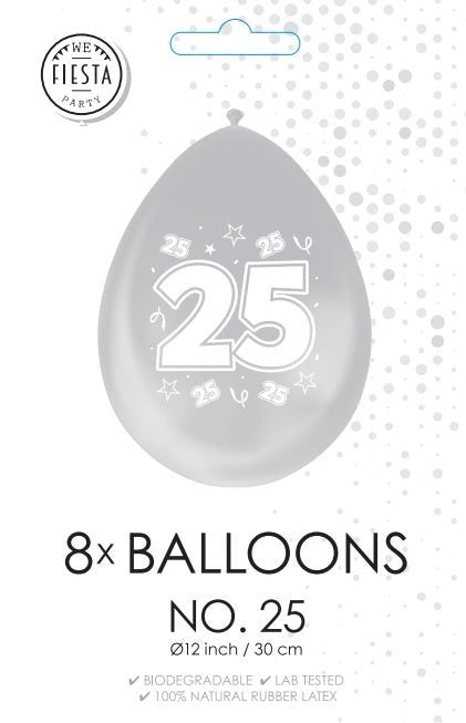 Srebrne Balony 25 Lat Metaliczne Dwustronne 30cm 8szt