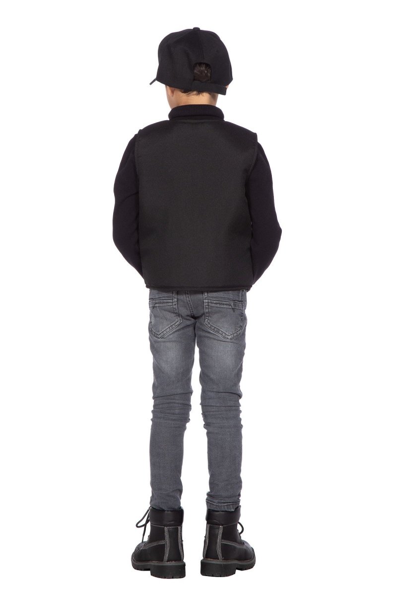 Wytrzymała czarna kamizelka SWAT dla chłopców, idealna na bale przebierańców lub imprezy tematyczne.