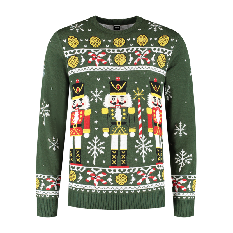 Ten świąteczny sweter dla mężczyzn Nutcracker Trio natychmiast doda klasycznego i świątecznego charakteru Twojemu strojowi. Sweter ma ciemnozieloną podstawę i jest ozdobiony trzema przyciągającymi wzrok postaciami dziadka do orzechów, tworząc tradycyjny i stylowy świąteczny wygląd. Idealny dla tych, którzy kochają eleganckie świąteczne swetry z charakterem.