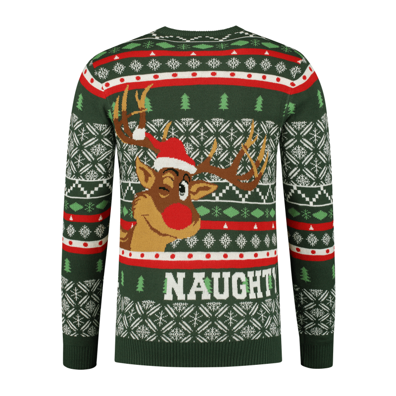 Przenieś świąteczny nastrój na wyższy poziom z tym świątecznym swetrem dla mężczyzn Naughty or Nice Rudolph! Wesołe połączenie zielonego, czerwonego i białego natychmiast tworzy najlepszy świąteczny look. Sweter ma zabawny nadruk Rudolfa z napisem Naughty or Nice, idealny dla każdego, kto dodaje humoru do swojego świątecznego stroju.