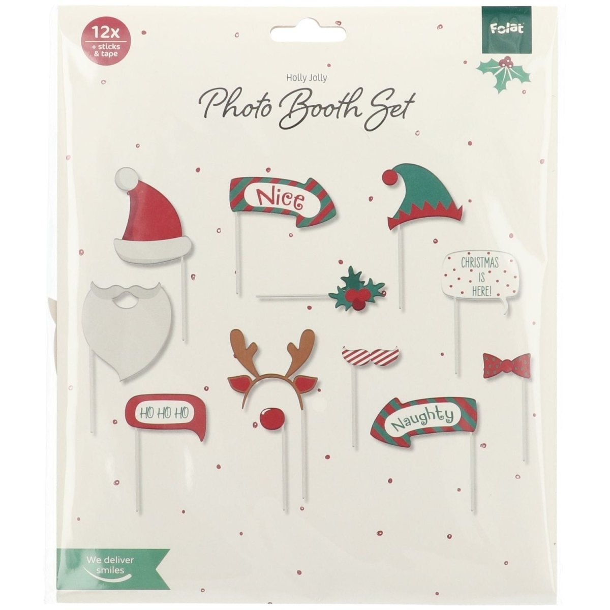 Uśmiechnij się! Akcesoria do fotobudki, Holly Jolly, 12 szt. Zawartość: 12 akcesoriów do fotobudki. Do wykorzystania na przykład podczas następujących przyjęć/imprez: Boże Narodzenie. Dzięki tym akcesoriom do fotobudki zawsze będziesz się dobrze bawić. Figurki są wykonane z jednostronnie zadrukowanego papieru, a patyczki z tworzywa sztucznego. Dołączone są dwustronne naklejki do przymocowania figurek do patyczków. Ten artykuł jest wykonany z papieru i plastiku