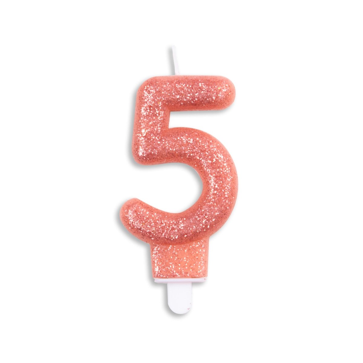 Świeczka 5 lat różowe złoto z brokatem 7 cm