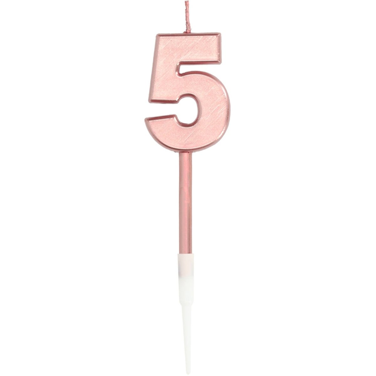 Świeca numer 5 Rose Gold Metallic. Zawartość: 1 świeca. Kolor: różowe złoto. Do wykorzystania na przykład podczas następujących uroczystości/imprez: Urodziny, Rocznica i Przyjęcie dla dzieci. Wymiary: 14 cm wysokości. Artykuł jest wykonany z wosku.