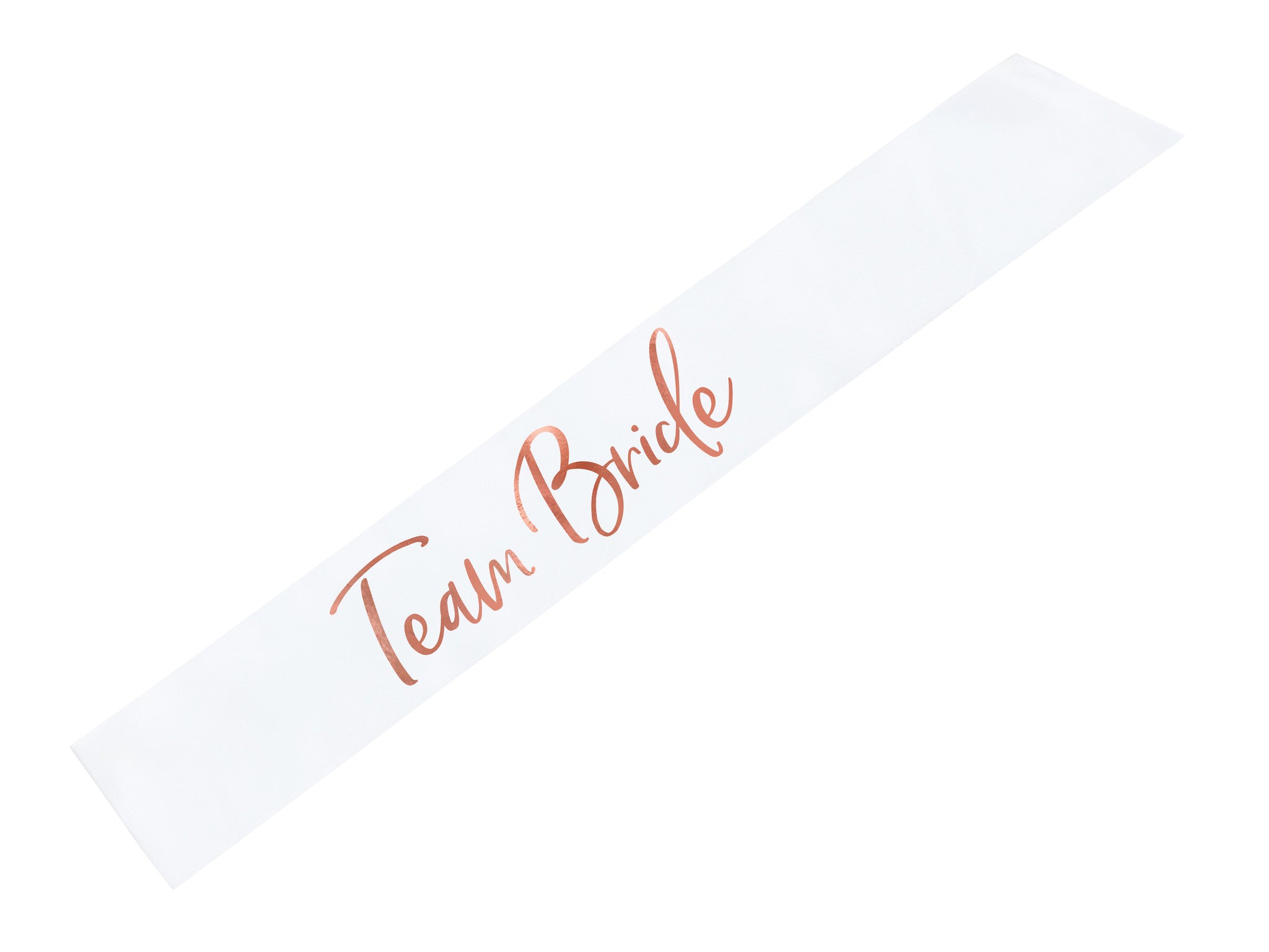 Zawartość: Satynowa szarfa Team Bride w kolorze białym z metalicznym nadrukiem w kolorze różowego złota o szerokości ok. 10 cm, długość ok. 75 cm.