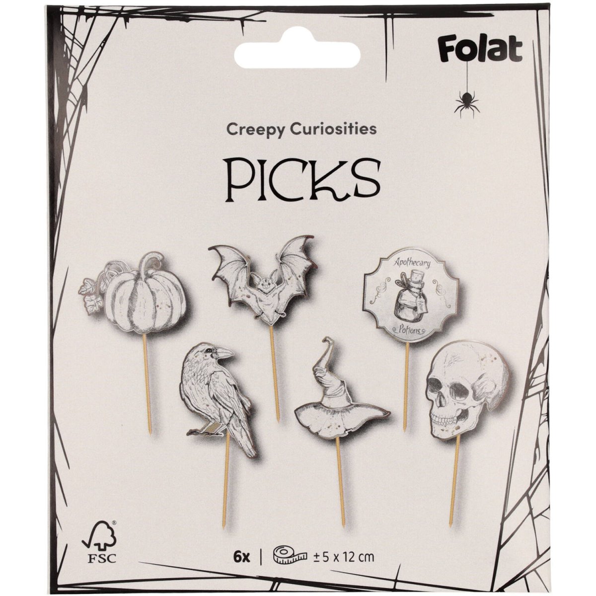 Przerażające osobliwości! Prickers - Creepy Curiosities - 6 sztuk. Zawartość: 6 wykałaczek. Na przykład do użytku podczas następujących imprez / okazji: Halloween, Impreza tematyczna. Nakłuwaj na imprezach Halloween za pomocą tych 6 nakłuwaczy: dynia, kruk, nietoperz, kapelusz czarownicy, mikstura, czaszka. Wykałaczki mają wymiary około 5 x 12 cm. Dwustronny nadruk z naprawdę błyszczącymi złotymi detalami dzięki zastosowanej technice tłoczenia na gorąco. Ten przedmiot jest wykonany z papieru FSC.