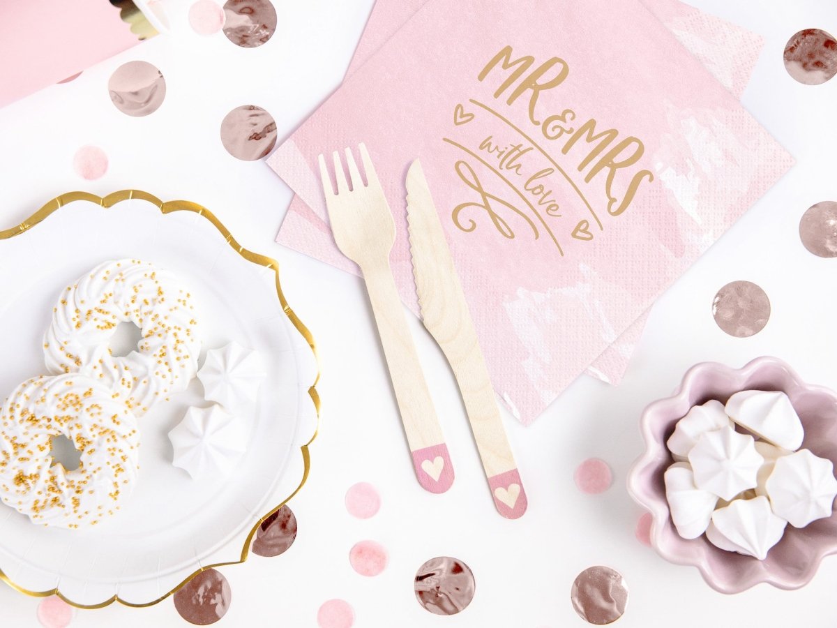 Zawartość: Sztućce drewniane Serca z różowym nadrukiem, wysokość ok. 16 cm, zestaw zawiera 6 łyżek, 6 widelców i 6 noży. (1 HPT/18 szt.)