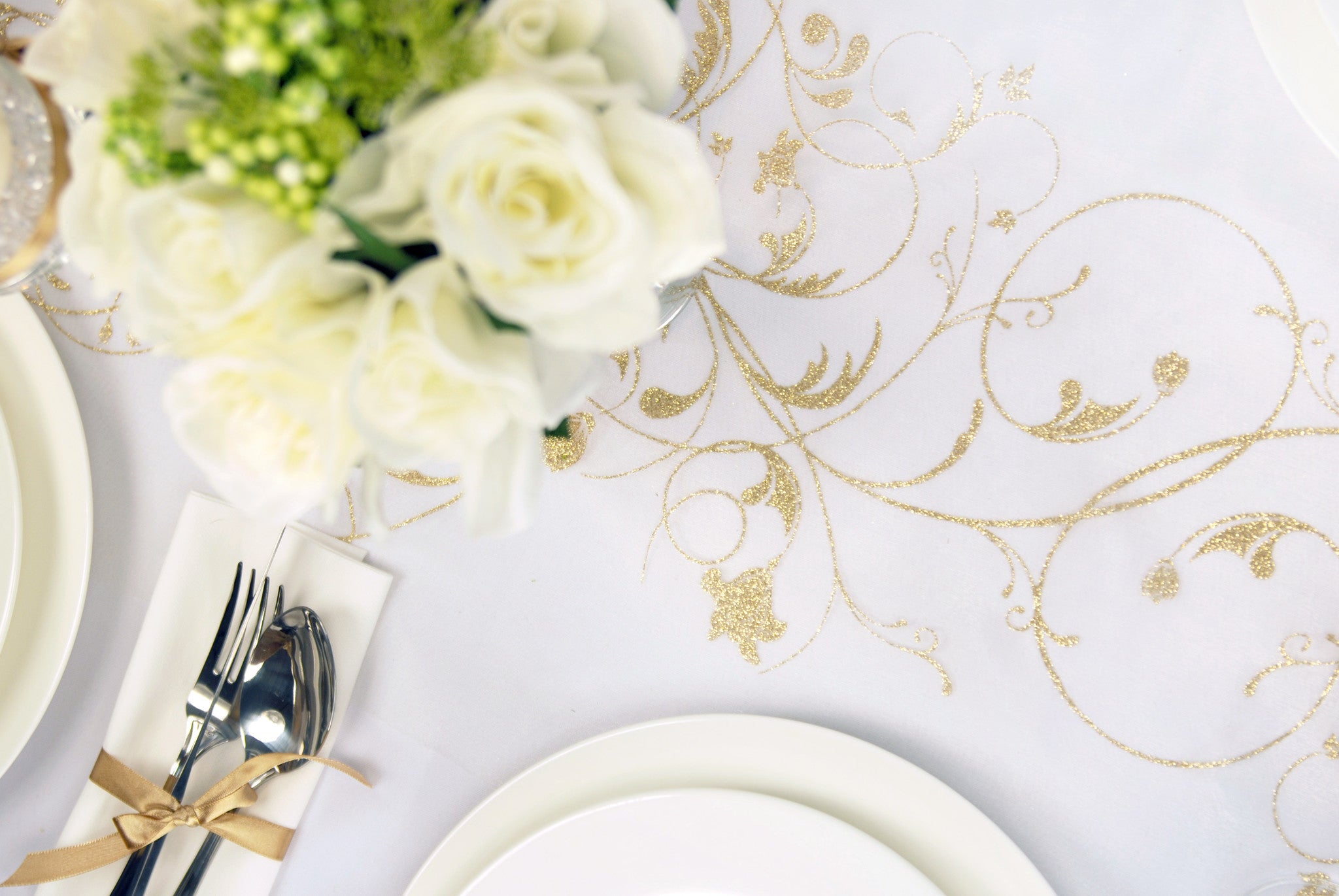 Zawartość opakowania:Vanilla Cream Organza Fabric Gold Flowers 36cm 9m