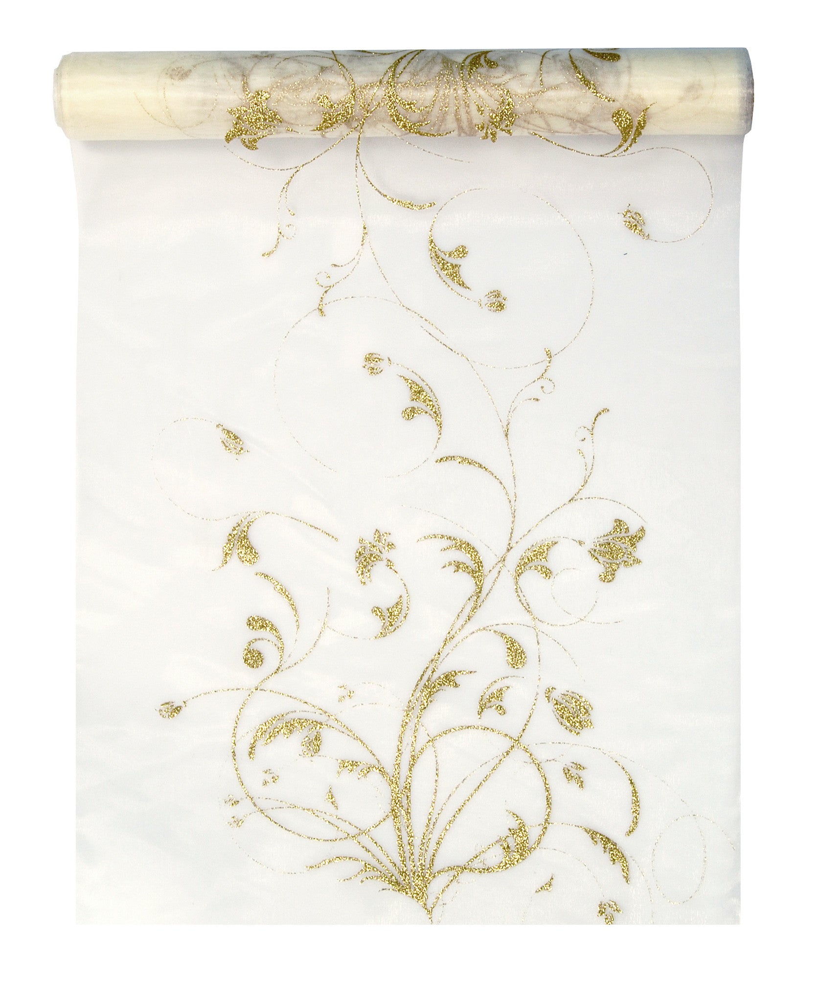 Skład: Organza drukowana, kremowa z jednostronnym nadrukiem złotego brokatu, rozmiar 0.36x9 metrów.