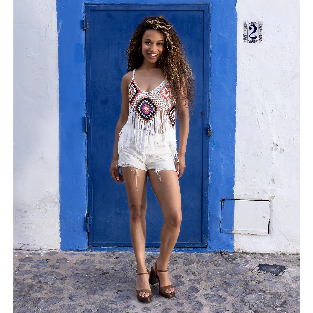 Wesołe wzory w kratkę w kolorach retro nadają temu szydełkowemu topowi zabawny wygląd boho, idealny na słoneczne dni, letnie imprezy i festiwale. Przewiewny materiał, wygodne dopasowanie i panelowe frędzle sprawiają, że ten crop top w rozmiarze M jest obowiązkowym elementem każdej imprezowej garderoby.