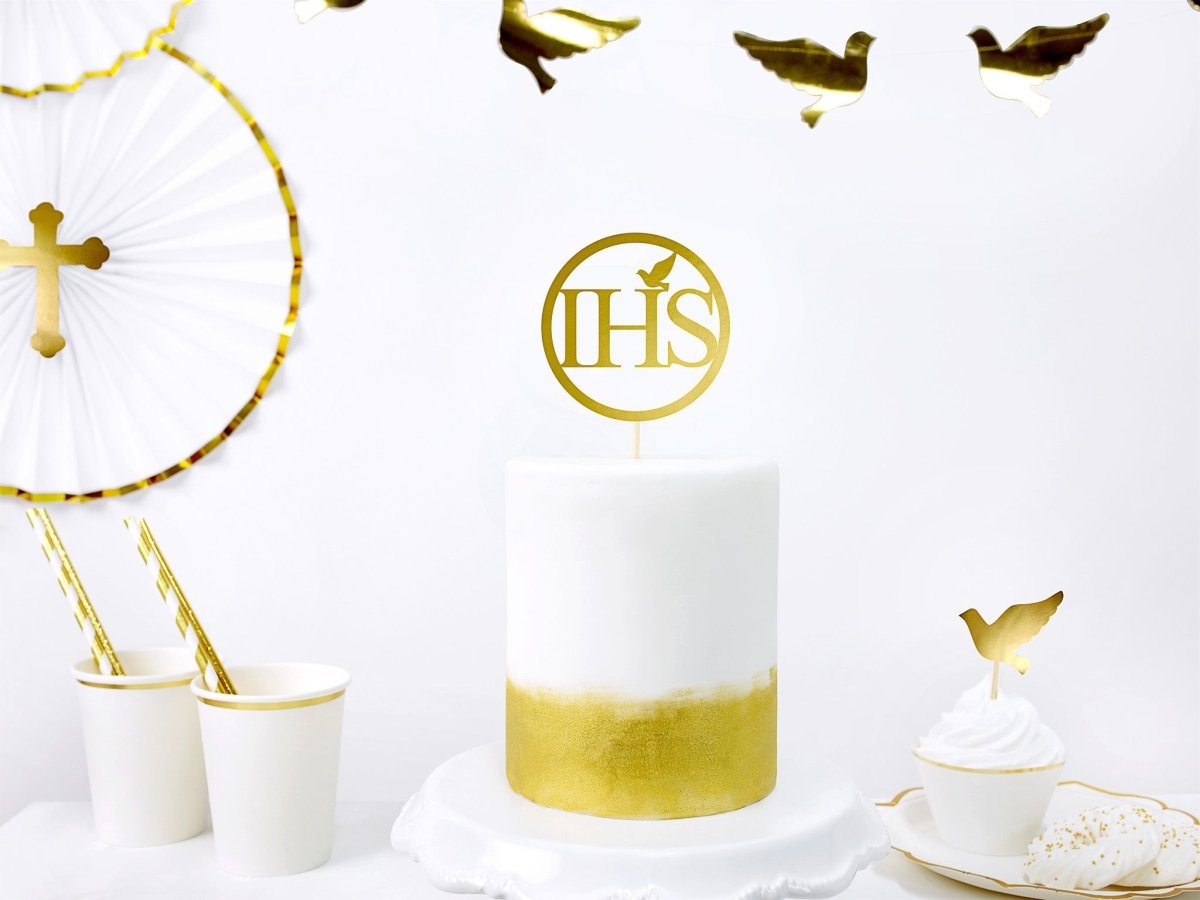Zawartość opakowania:Cake topper Komunia IHS Gold 22cm