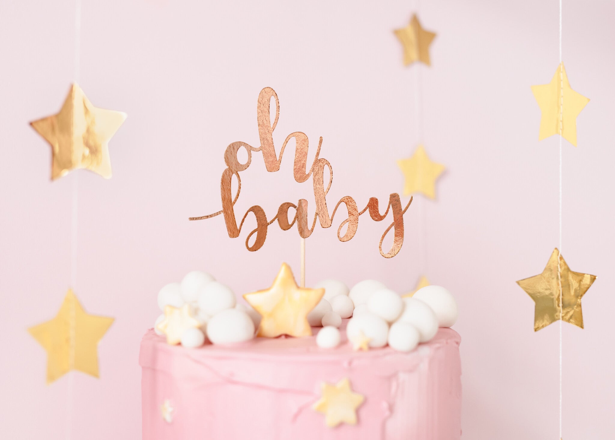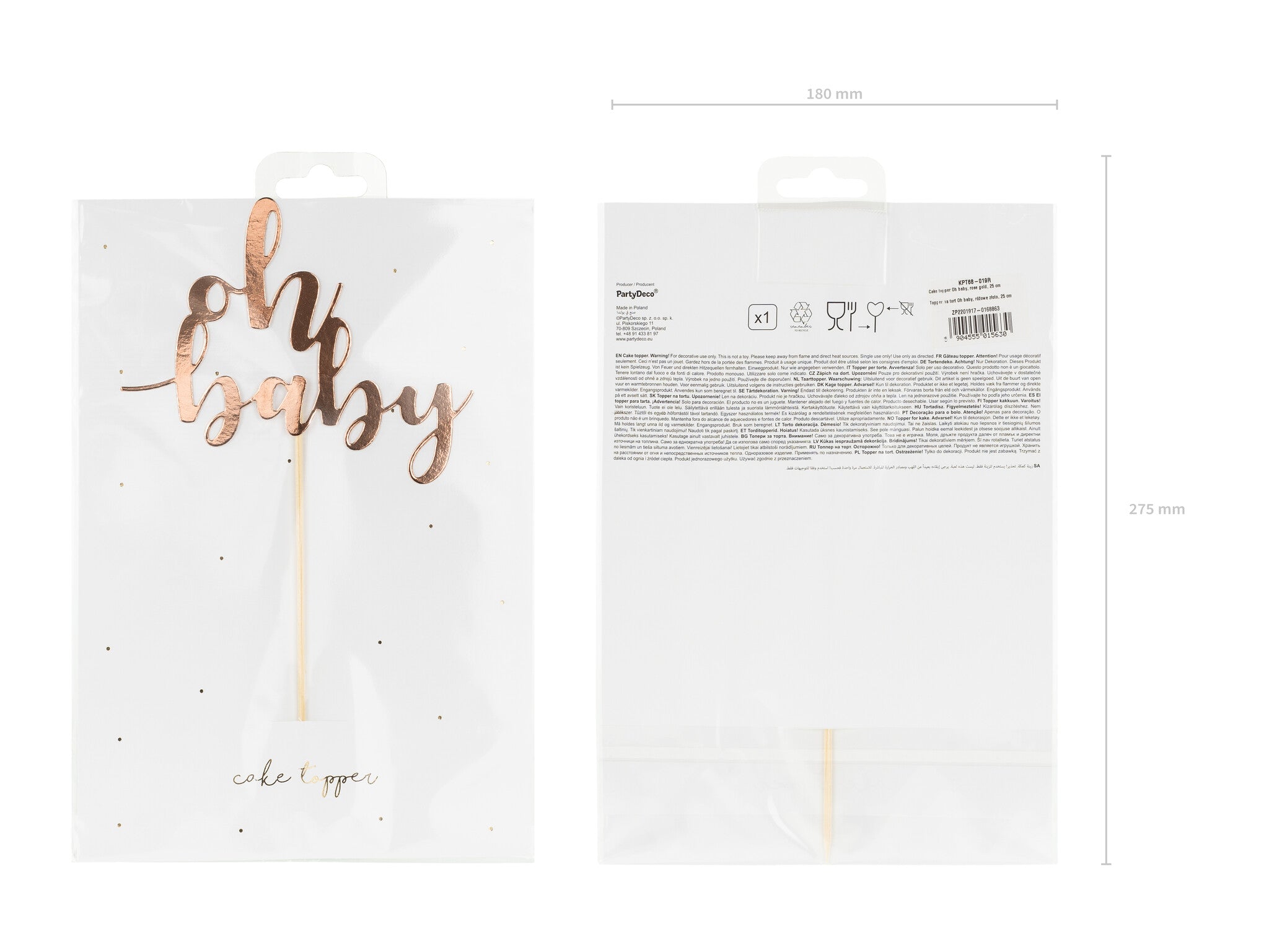 Topper na tort, napis Oh baby, różowe złoto, wysokość ok. 25 cm.