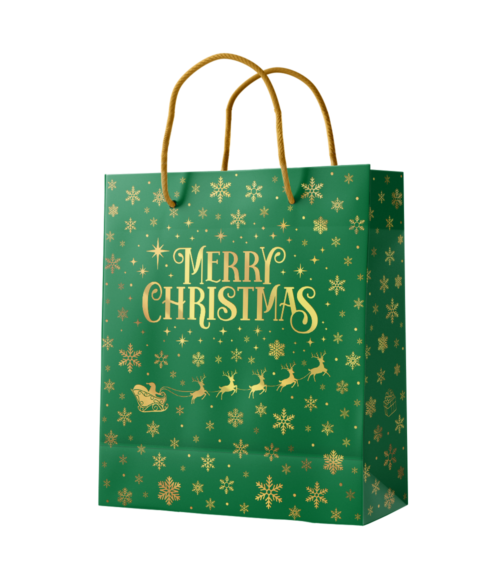 Nadaj swoim świątecznym prezentom świąteczny charakter dzięki tej zielonej torbie prezentowej Merry Christmasz złotym nadrukiem i wesołymi motywami świątecznymi, takimi jak renifery, płatki śniegu i tekst Merry Christmas. Idealna do stylowego pakowania drobnych prezentów, smakołyków lub niespodzianek w okresie świątecznym