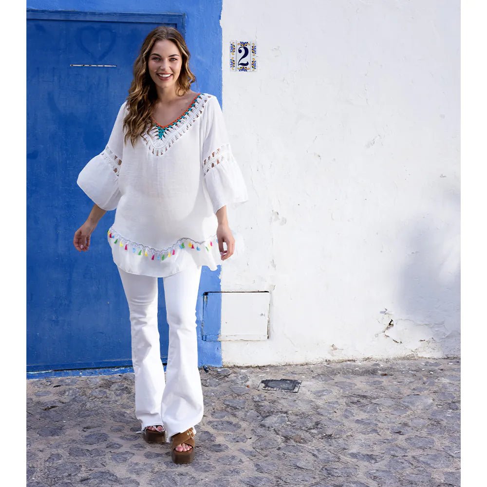 Ta letnia biała tunika jest idealna na relaksujący dzień na plaży, spacer po mieście lub jako strój boho na letni festiwal. Przewiewny materiał zapewnia wygodne dopasowanie, a kolorowe detale wzdłuż dekoltu i dołu dodają tuniki letniego uroku. Dostępna w jednym standardowym rozmiarze dla kobiet.