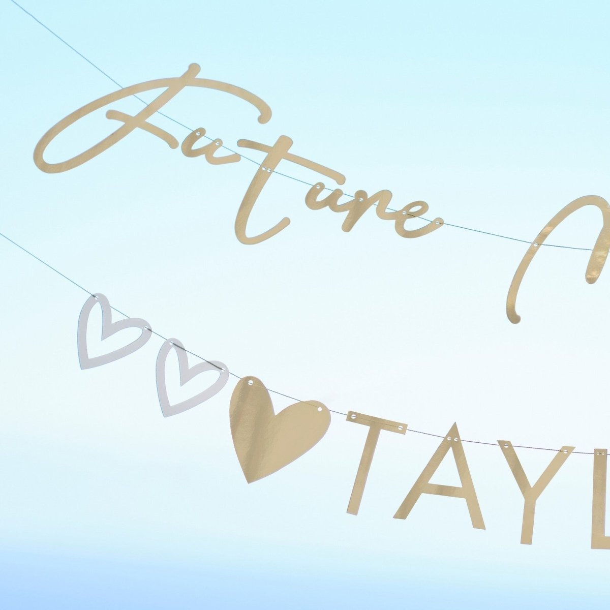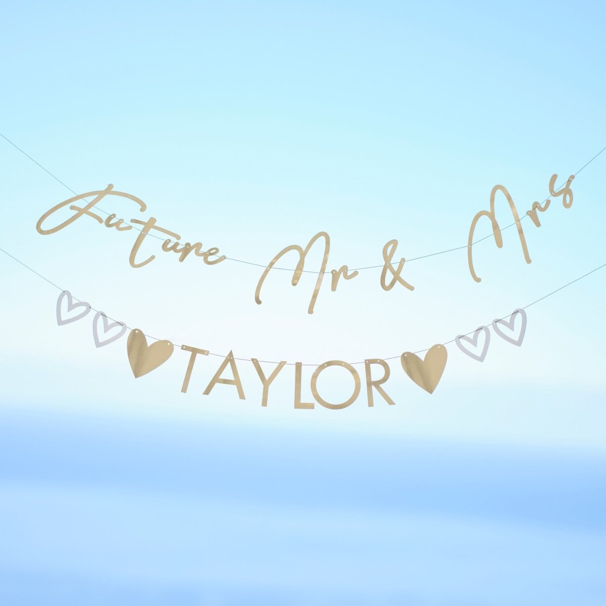 Stylowa i modna, ta złota spersonalizowana girlanda sprawi, że Twoje przyjęcie zaręczynowe będzie wyjątkowe dla Ciebie i Twojej narzeczonej i spodoba się wszystkim gościom.