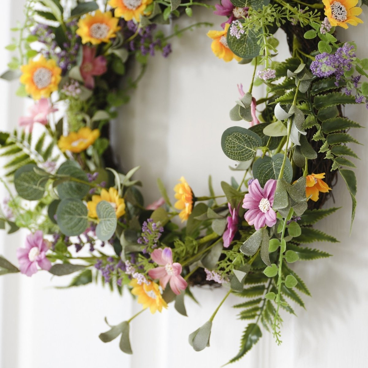 Ten dekoracyjny wiosenny wianek zawiera małe żółte i różowe stokrotki, lawendę i przyjemny akcent paproci, bluszczu i szałwiowo-zielonych liści.